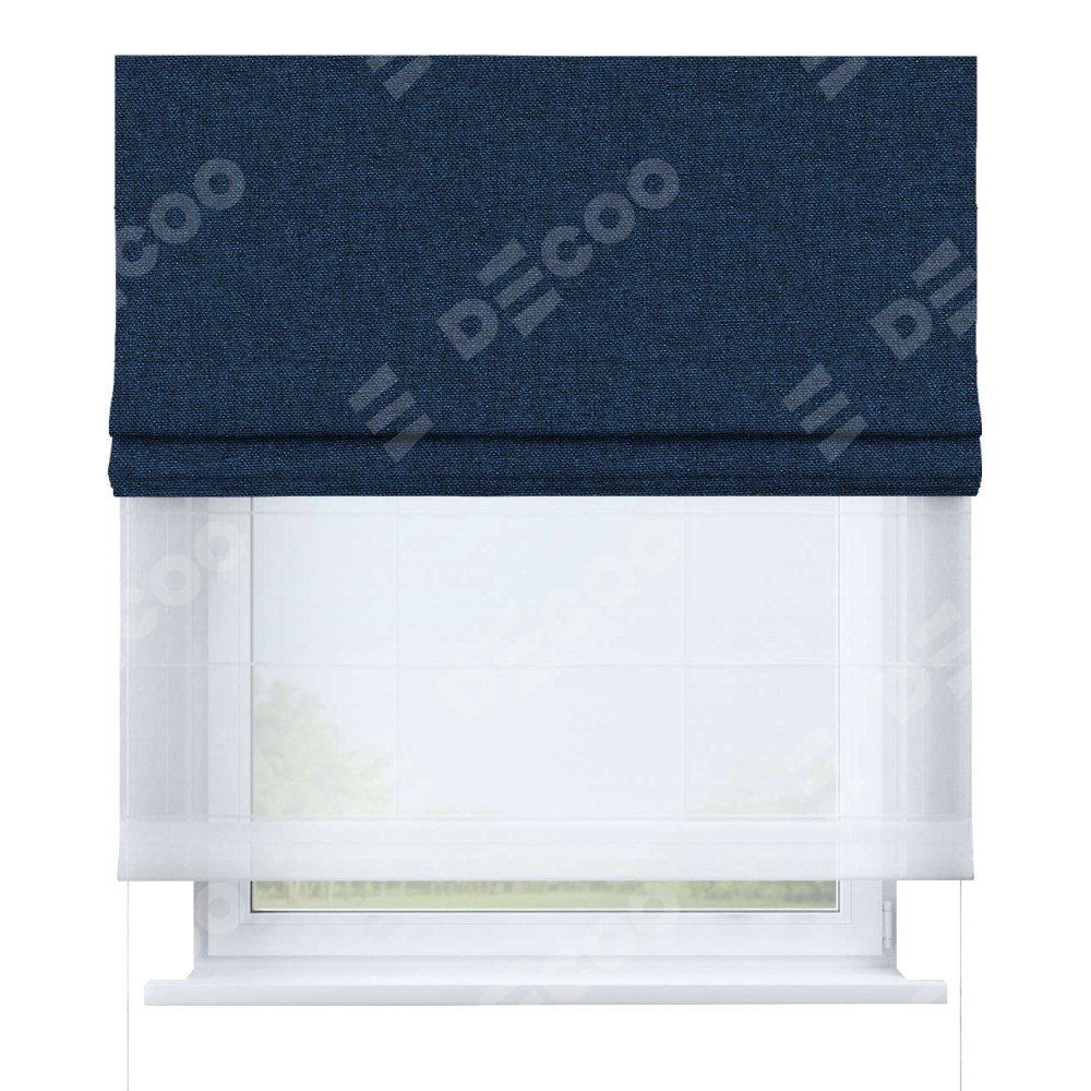 Римская штора день-ночь производителя «Cortin», используется для проёма, пошита из двух полотен, с лицевой стороны лён кашемир тёмно-синий артикул 17215, вторая ткань тюль (по стандарту комплектуется тюль белого цвета артикул V-01). Имеет универсальный механизм и подходит для монтажа: на потолок, на стену и в нишу.