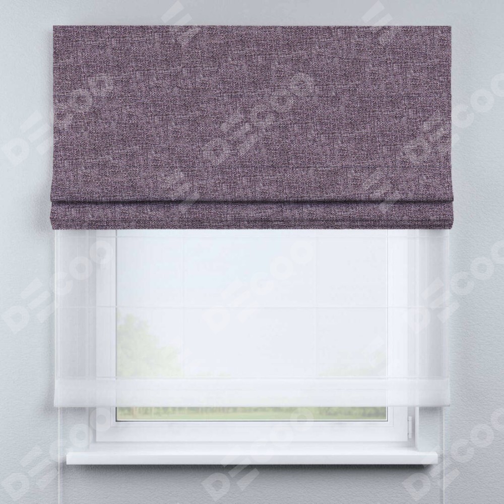Римская штора день-ночь производителя «Cortin», используется для проёма, пошита из двух полотен, с лицевой стороны лён кашемир фиолетовый артикул 17211, вторая ткань тюль (по стандарту комплектуется тюль белого цвета артикул V-01). Имеет универсальный механизм и подходит для монтажа: на потолок, на стену и в нишу.