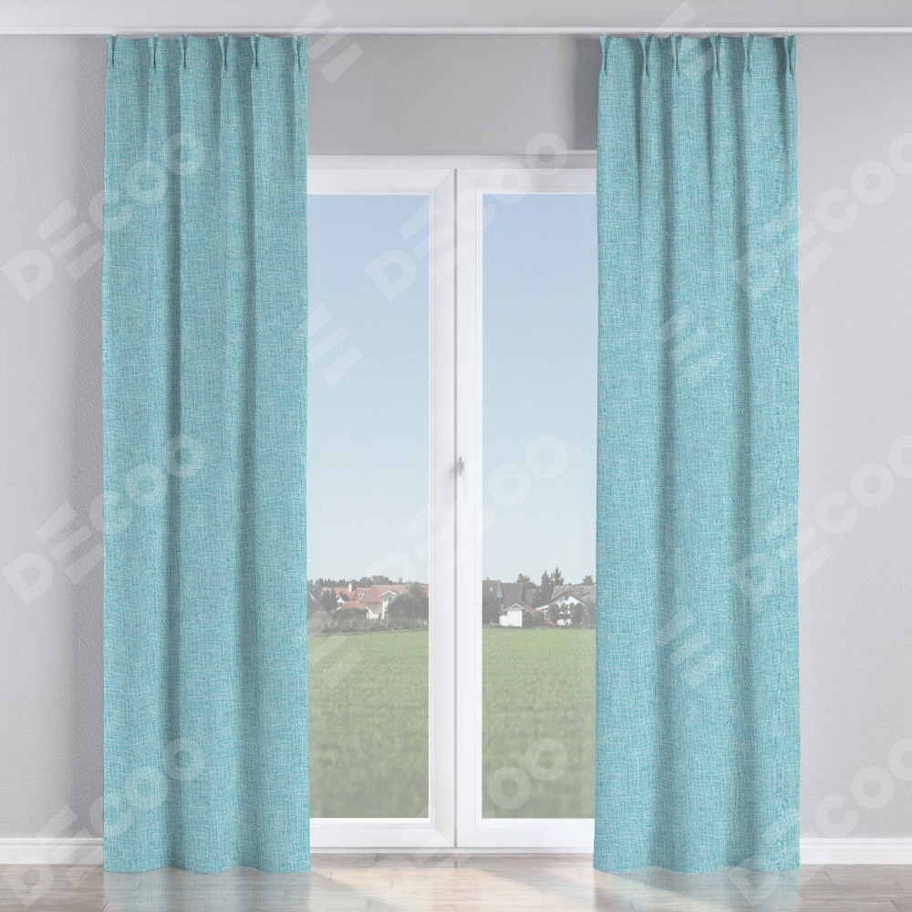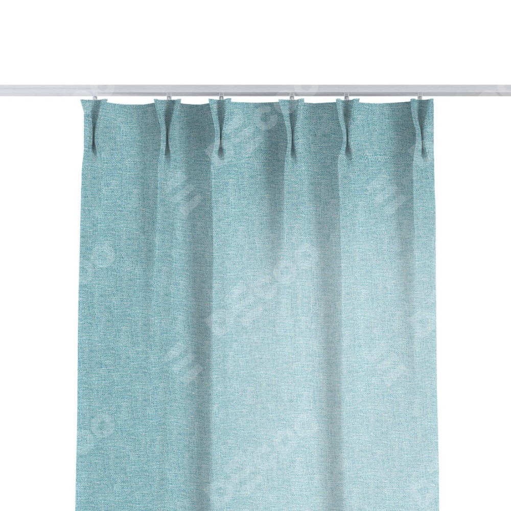 Комплект прямых штор, от производителя «Cortin», пошиты из ткани лён кашемир голубой, артикул ткани 21616. С изнаночной стороны в верхней части штор пристрачивается шторная лента с декоративными складками «Кустик». Для создания элегантных складок прямые шторы шьются по стандарту с коэффициентом 1:2 (на 100 см. ширины проёма 200 см. ширины ткани).
