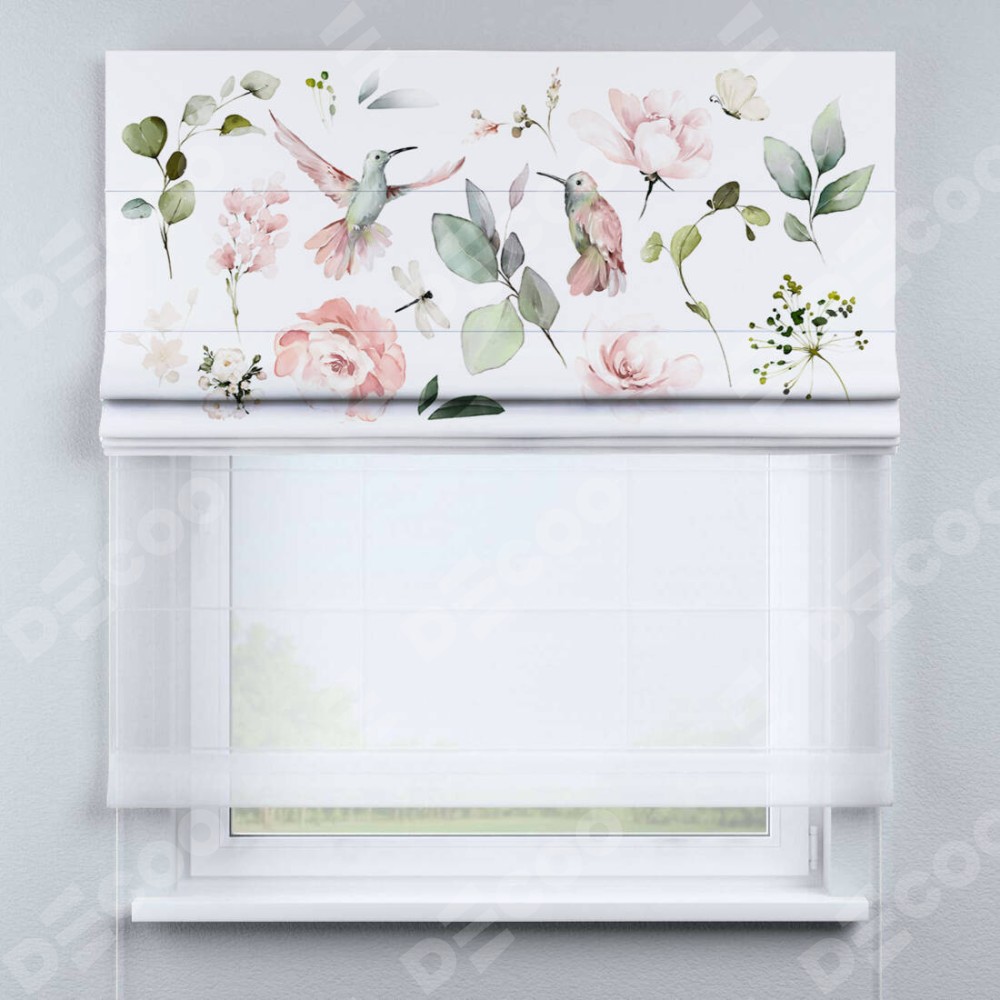 Римская штора день-ночь производителя «Cortin», используется для проёма, пошита из двух полотен, с лицевой блэкаут с нанесением сублимационной печати «Уютный сад», вторая ткань тюль (по стандарту комплектуется тюль белого цвета артикул V-01). Имеет универсальный механизм и подходит для монтажа: на потолок, на стену и в нишу.