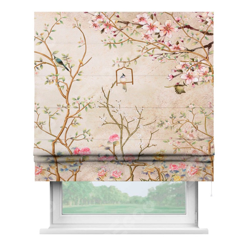 Римская штора производителя «Cortin», используется для проёма, пошита из ткани блэкаут с нанесением сублимационной печати «Весенний сад». Имеет универсальный механизм и подходит для монтажа: на потолок, на стену и в нишу.