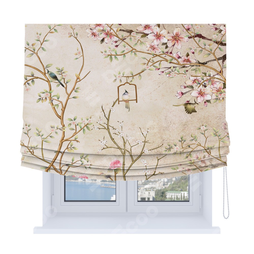 Римская штора Soft производителя «Cortin», используется для проёма, пошита из ткани блэкаут с нанесением сублимационной печати «Весенний сад». Имеет универсальный механизм и подходит для монтажа: на потолок, на стену и в нишу. В отличие от стандартных римских штор, римская штора Soft не имеет горизонтальных вставок и нижнего отвеса. Это позволяет ткани произвольно драпироваться в свободные мягкие складки.