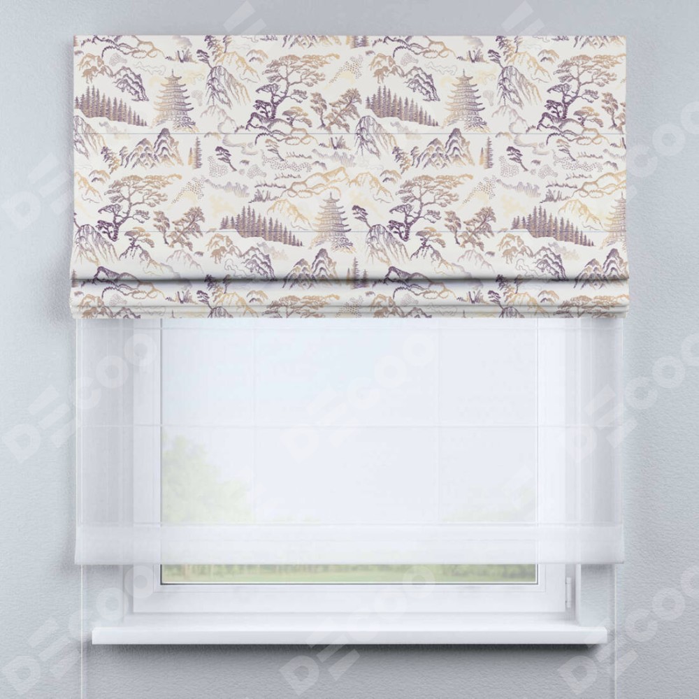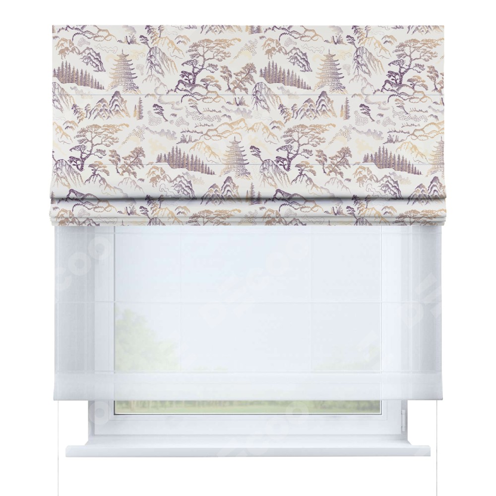 Римская штора день-ночь производителя «Cortin», используется для проёма, пошита из двух полотен, с лицевой блэкаут с нанесением сублимационной печати «Горные вершины», вторая ткань тюль (по стандарту комплектуется тюль белого цвета артикул V-01). Имеет универсальный механизм и подходит для монтажа: на потолок, на стену и в нишу.