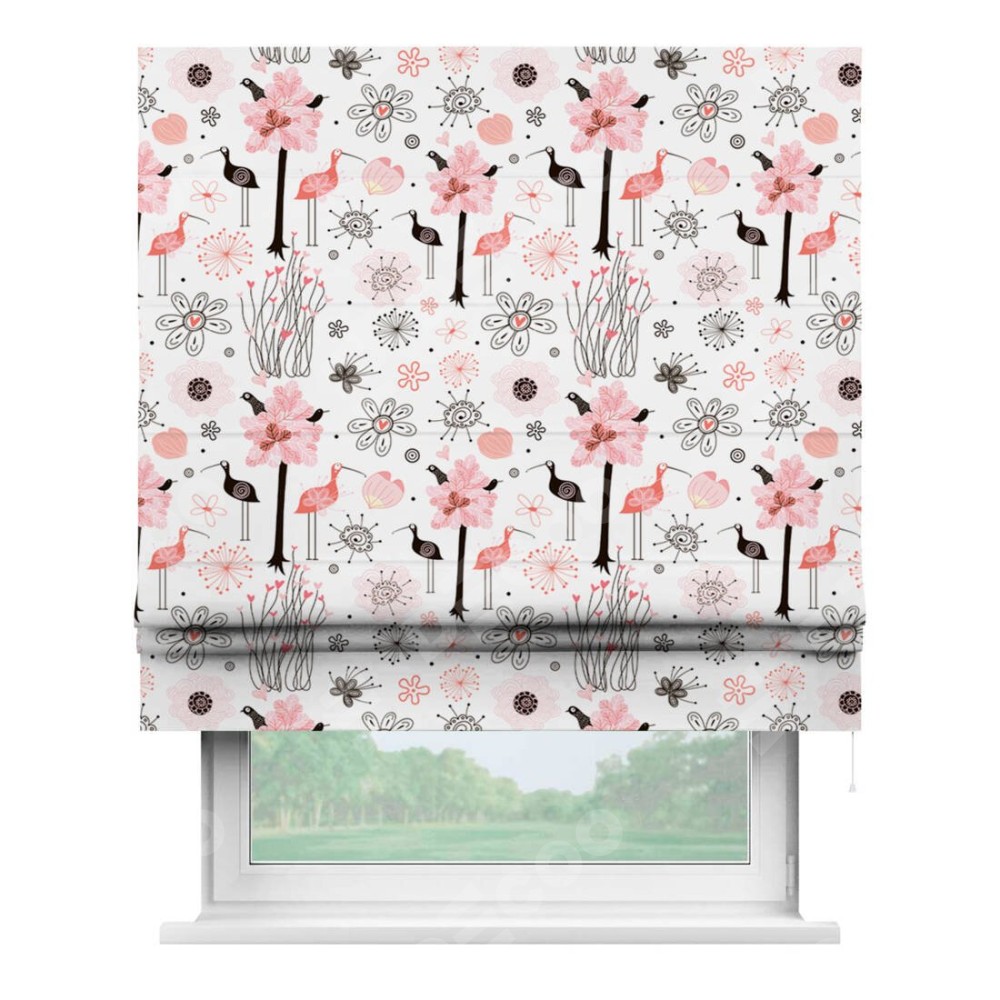 Римская штора производителя «Cortin», используется для проёма, пошита из ткани блэкаут с нанесением сублимационной печати «Любопытные птички». Имеет универсальный механизм и подходит для монтажа: на потолок, на стену и в нишу.