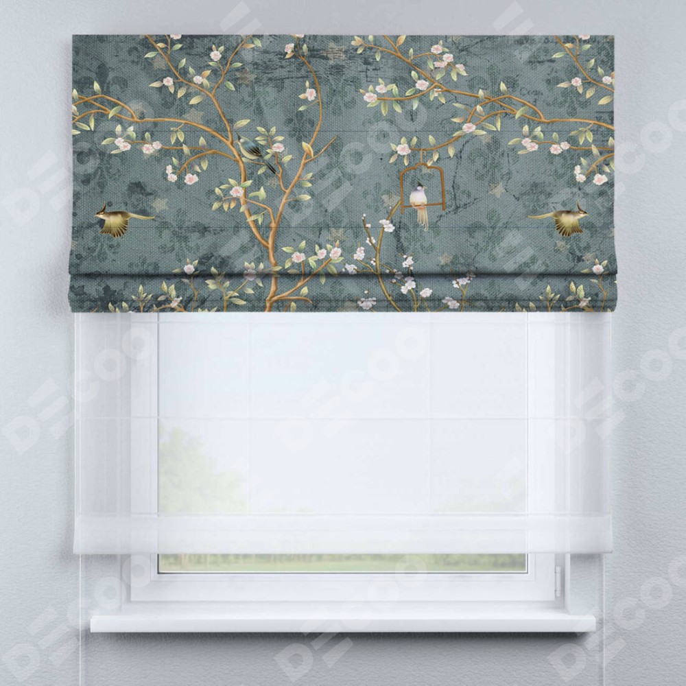 Римская штора день-ночь производителя «Cortin», используется для проёма, пошита из двух полотен, с лицевой блэкаут с нанесением сублимационной печати «Тенистый сад», вторая ткань тюль (по стандарту комплектуется тюль белого цвета артикул V-01). Имеет универсальный механизм и подходит для монтажа: на потолок, на стену и в нишу.