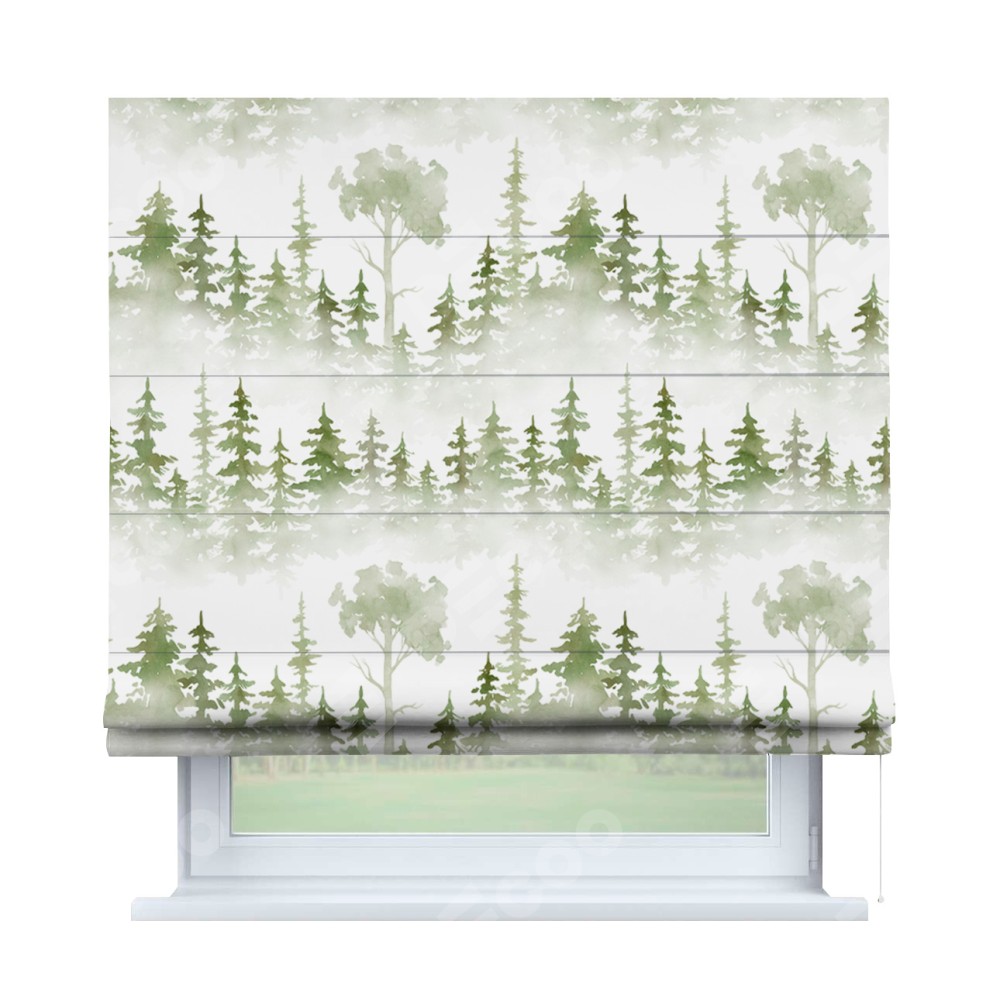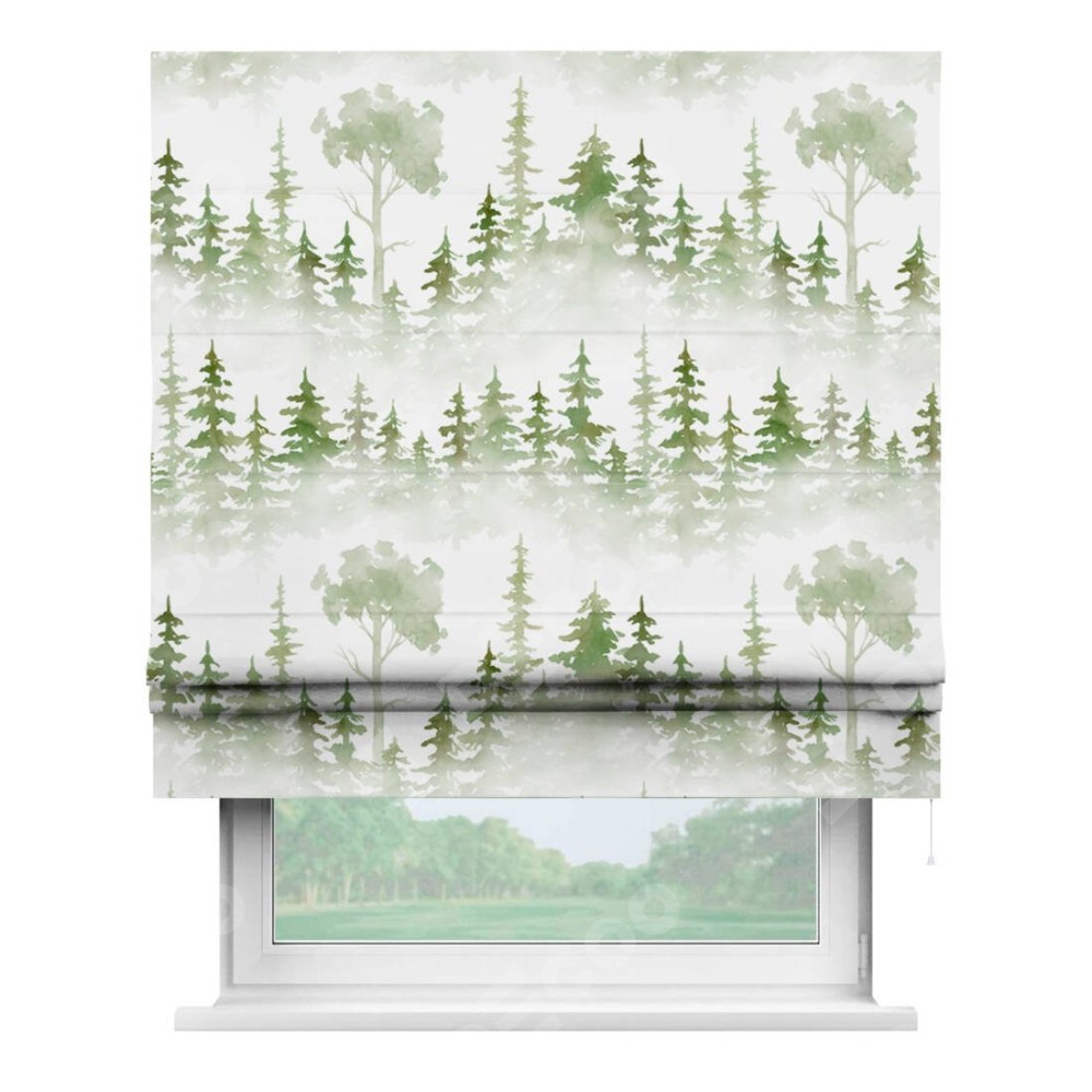 Римская штора производителя «Cortin», используется для проёма, пошита из ткани блэкаут с нанесением сублимационной печати «Туманный лес». Имеет универсальный механизм и подходит для монтажа: на потолок, на стену и в нишу.