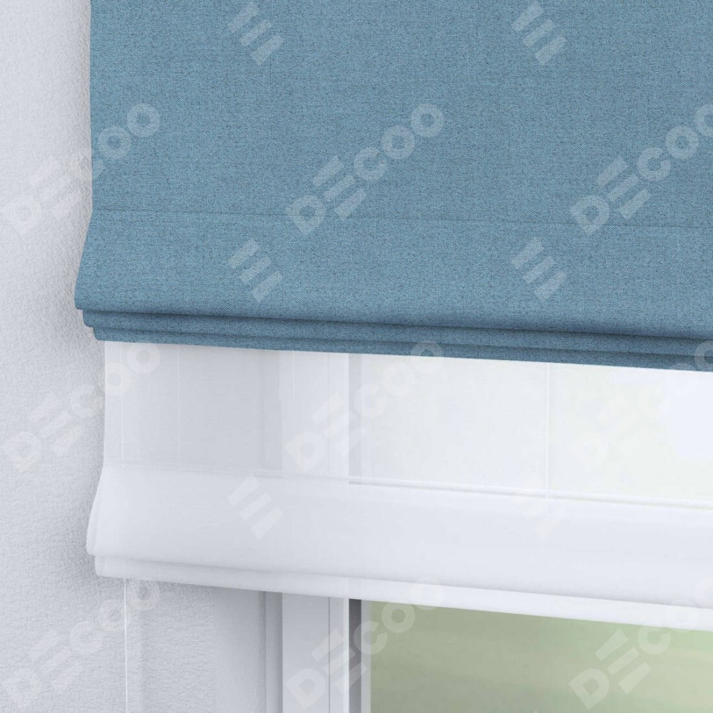 Римская штора день-ночь производителя «Cortin», используется для проёма, пошита из двух полотен, с лицевой стороны лён блэкаут голубой артикул 69574, вторая ткань тюль (по стандарту комплектуется тюль белого цвета артикул V-01). Имеет универсальный механизм и подходит для монтажа: на потолок, на стену и в нишу.