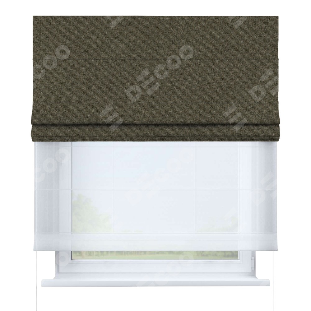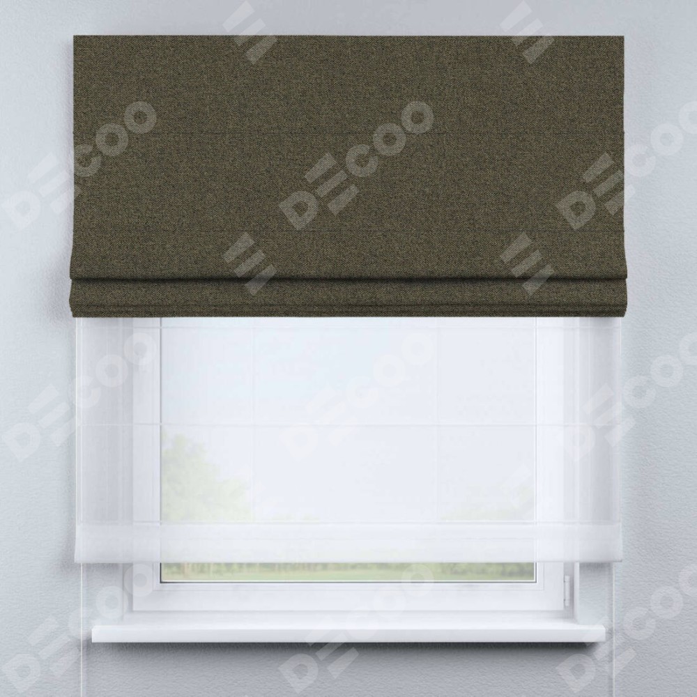 Римская штора день-ночь производителя «Cortin», используется для проёма, пошита из двух полотен, с лицевой стороны лён блэкаут коричневый артикул 69383, вторая ткань тюль (по стандарту комплектуется тюль белого цвета артикул V-01). Имеет универсальный механизм и подходит для монтажа: на потолок, на стену и в нишу.