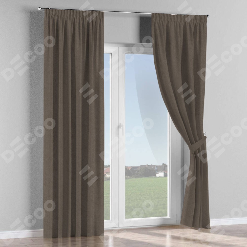 Комплект прямых штор, от производителя «Cortin», пошиты из ткани лён блэкаут коричневый, артикул ткани 69383. С изнаночной стороны в верхней части штор пристрачивается шторная лента с декоративными складками «Карандаш». Для создания элегантных складок прямые шторы шьются по стандарту с коэффициентом 1:2 (на 100 см. ширины проёма 200 см. ширины ткани).
