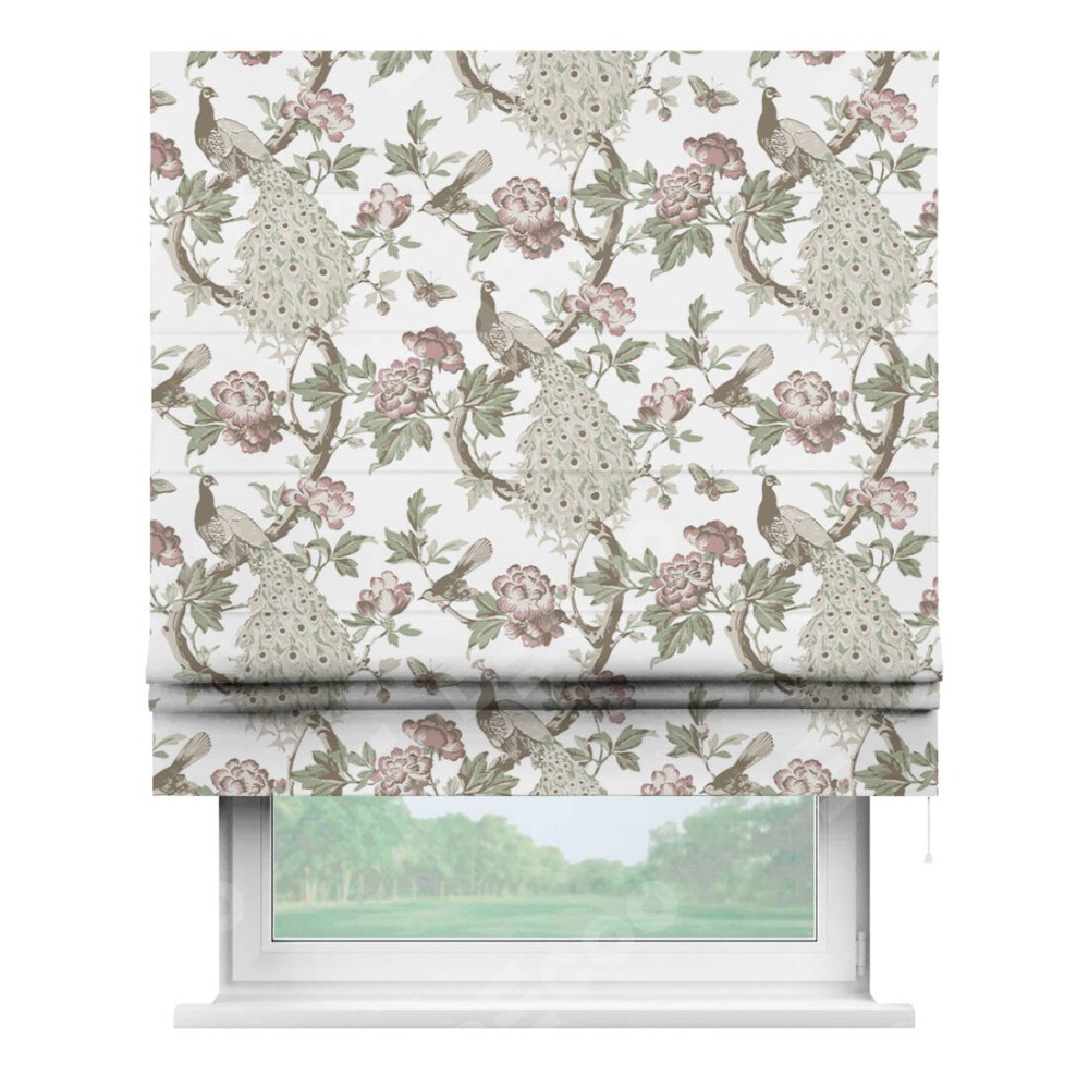 Римская штора производителя «Cortin», используется для проёма, пошита из ткани блэкаут с нанесением сублимационной печати «Гордые павлины». Имеет универсальный механизм и подходит для монтажа: на потолок, на стену и в нишу.