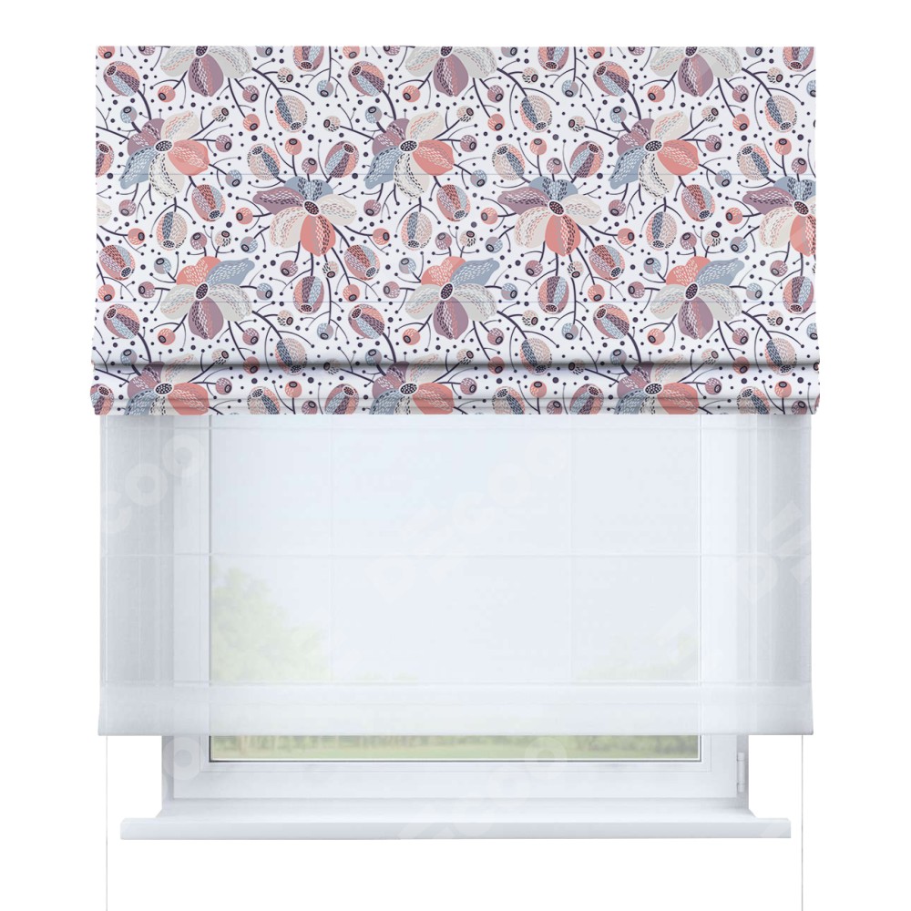 Римская штора день-ночь производителя «Cortin», используется для проёма, пошита из двух полотен, с лицевой блэкаут с нанесением сублимационной печати «Цветочный микс», вторая ткань тюль (по стандарту комплектуется тюль белого цвета артикул V-01). Имеет универсальный механизм и подходит для монтажа: на потолок, на стену и в нишу.