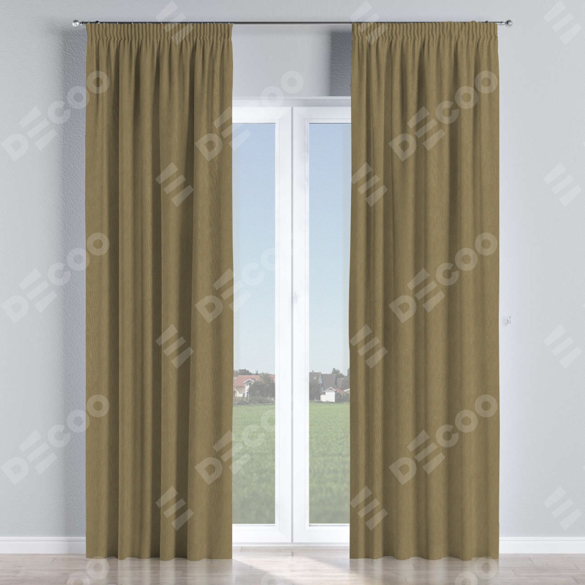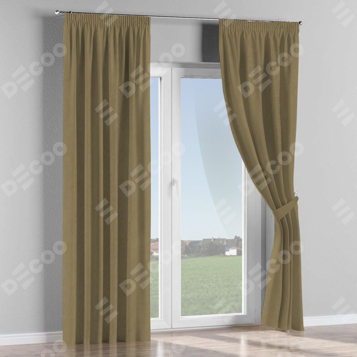 Комплект прямых штор, от производителя «Cortin», пошиты из ткани блэкаут однотонный бежево-золотой, артикул ткани 12095−2. С изнаночной стороны в верхней части штор пристрачивается шторная лента с декоративными складками «Карандаш». Для создания элегантных складок прямые шторы шьются по стандарту с коэффициентом 1:2 (на 100 см. ширины проёма 200 см. ширины ткани).