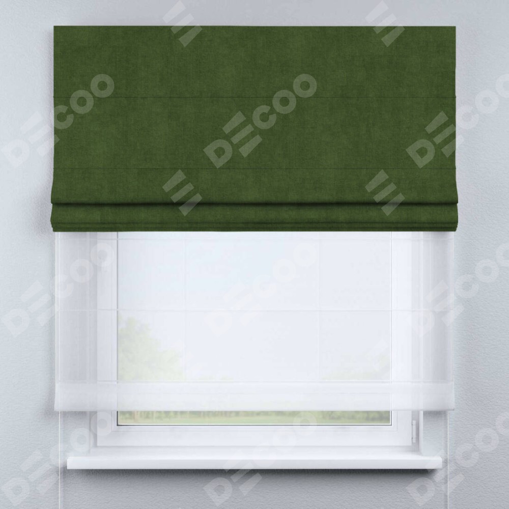 Римская штора день-ночь производителя «Cortin», используется для проёма, пошита из двух полотен, с лицевой стороны вельвет тёмно-салатовый артикул 33805, вторая ткань тюль (по стандарту комплектуется тюль белого цвета артикул V-01). Имеет универсальный механизм и подходит для монтажа: на потолок, на стену и в нишу.