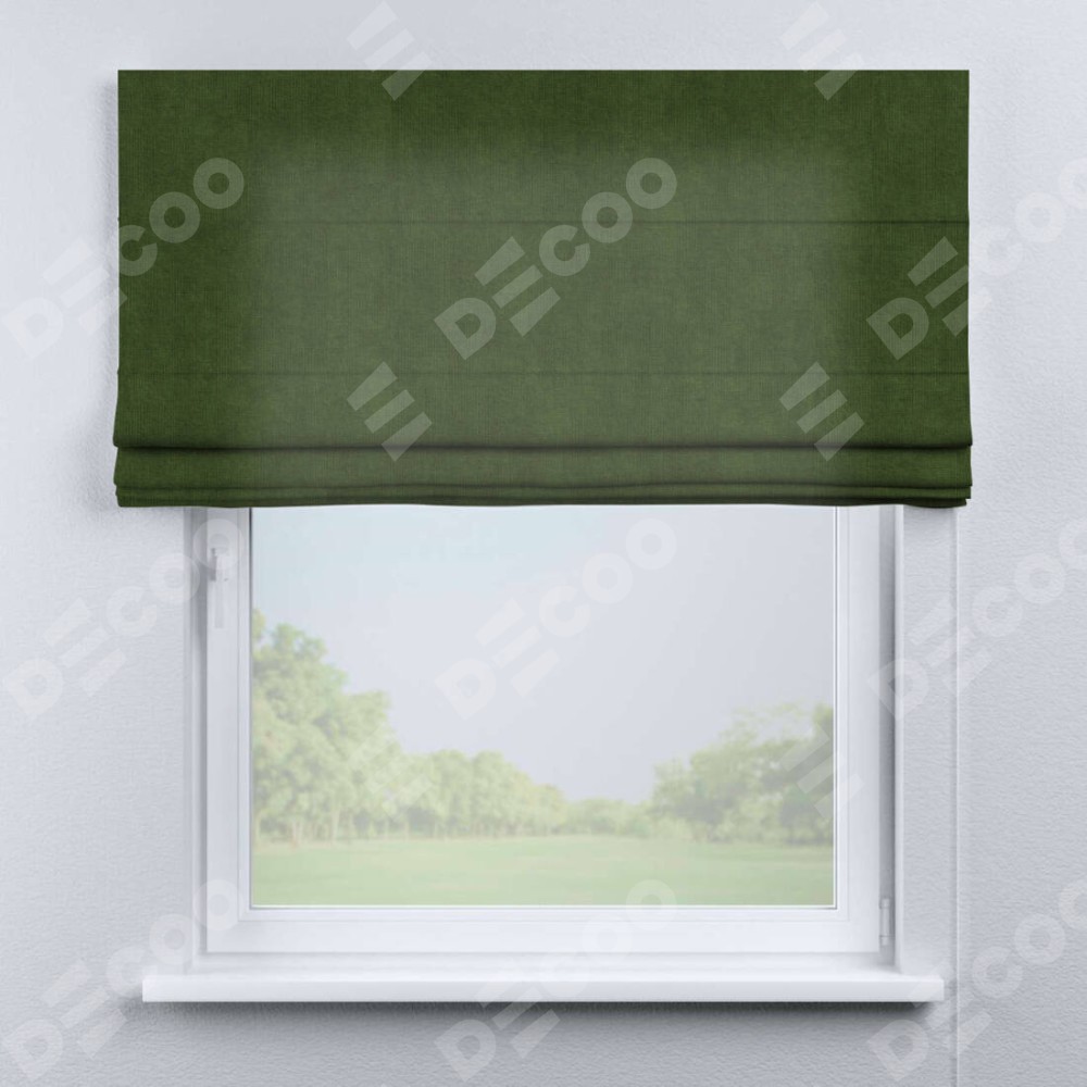 Римская штора производителя «Cortin», используется для проёма, пошита из ткани вельвет тёмно-салатовый, артикул ткани 33805. Имеет универсальный механизм и подходит для монтажа: на потолок, на стену и в нишу.
