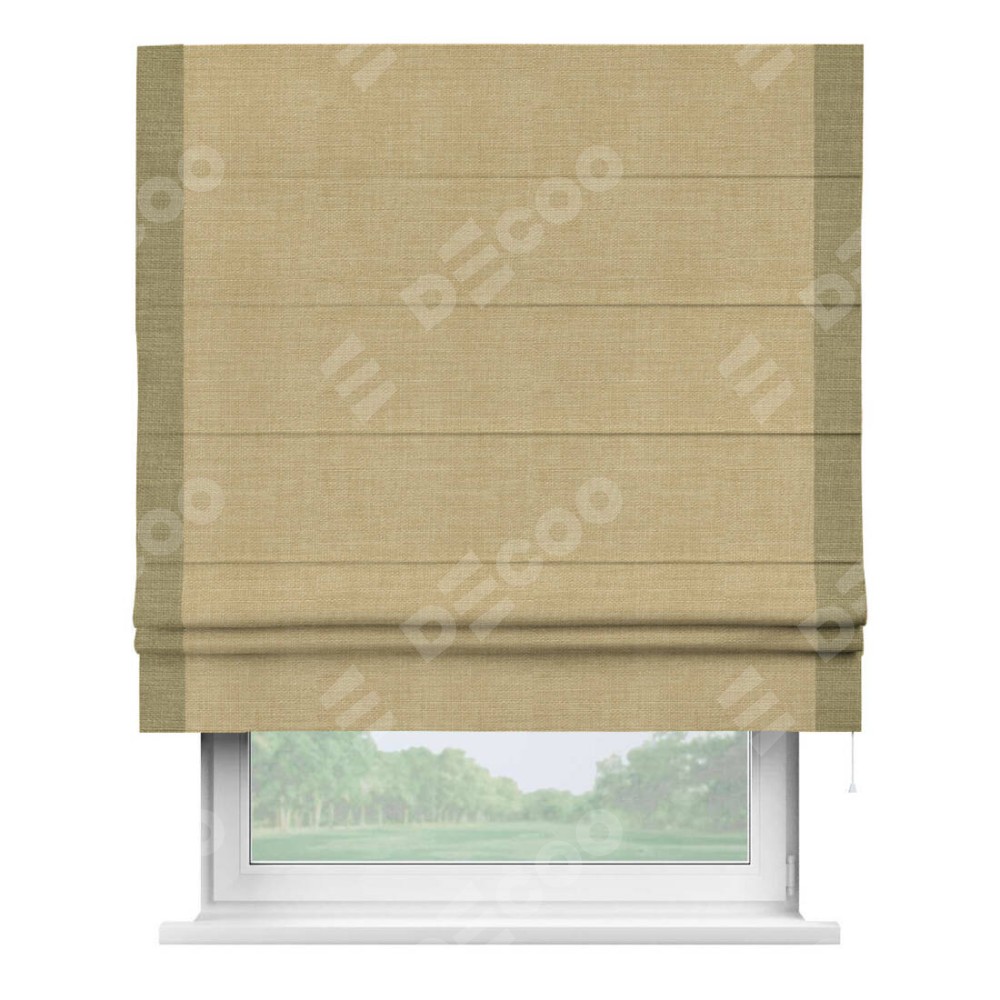 Римская штора производителя «Cortin», используется для проёма, пошита из ткани лён бежевый, артикул 7442. Отделка шторы кантом «Стрим Дуо», ткань для канта используется из льна разной расцветки на выбор. Имеет универсальный механизм и подходит для монтажа: на потолок, на стену и в нишу.