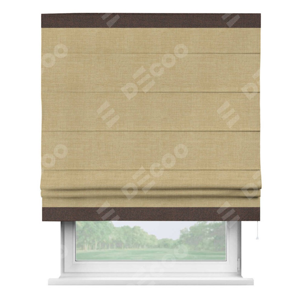 Римская штора производителя «Cortin», используется для проёма, пошита из ткани лён бежевый, артикул 7442. Отделка шторы кантом «Горизонт», ткань для канта используется из льна разной расцветки на выбор. Имеет универсальный механизм и подходит для монтажа: на потолок, на стену и в нишу.