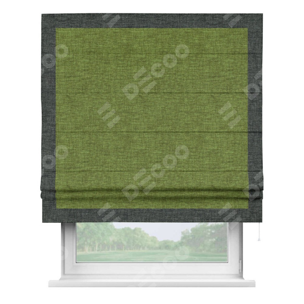 Римская штора производителя «Cortin», используется для проёма, пошита из ткани рогожка димаут салатовый, артикул 80423. Отделка шторы кантом «Чесс», ткань для канта используется из рогожки димаут разной расцветки на выбор. Имеет универсальный механизм и подходит для монтажа: на потолок, на стену и в нишу.