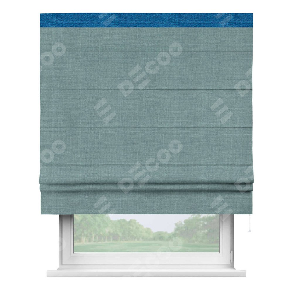 Римская штора производителя «Cortin», используется для проёма, пошита из ткани лён голубой, артикул 74 736. Отделка шторы кантом «Кинг», ткань для канта используется из льна разной расцветки на выбор. Имеет универсальный механизм и подходит для монтажа: на потолок, на стену и в нишу.