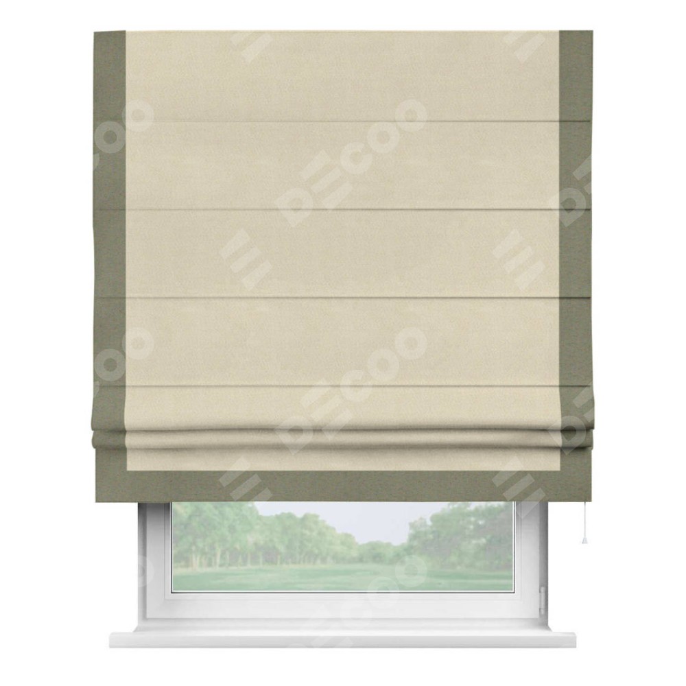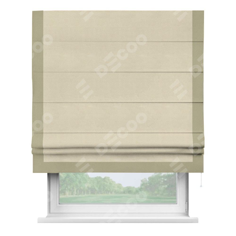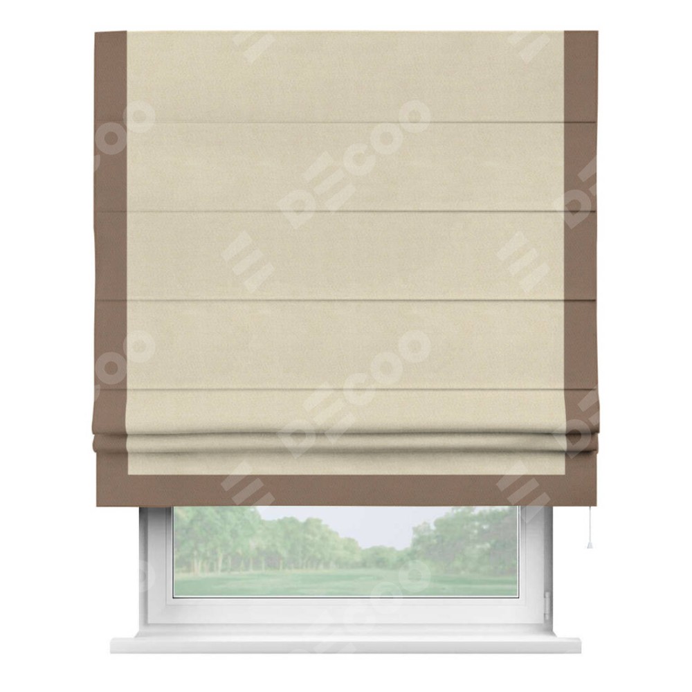 Римская штора производителя «Cortin», используется для проёма, пошита из ткани блэкаут однотонный бежевый, артикул ткани 13125. Отделка шторы кантом «Виктория», ткань для канта используется из блэкаута однотонного разной расцветки на выбор. Имеет универсальный механизм и подходит для монтажа: на потолок, на стену и в нишу.