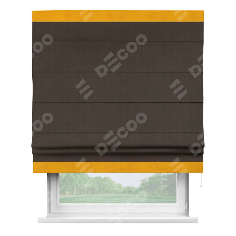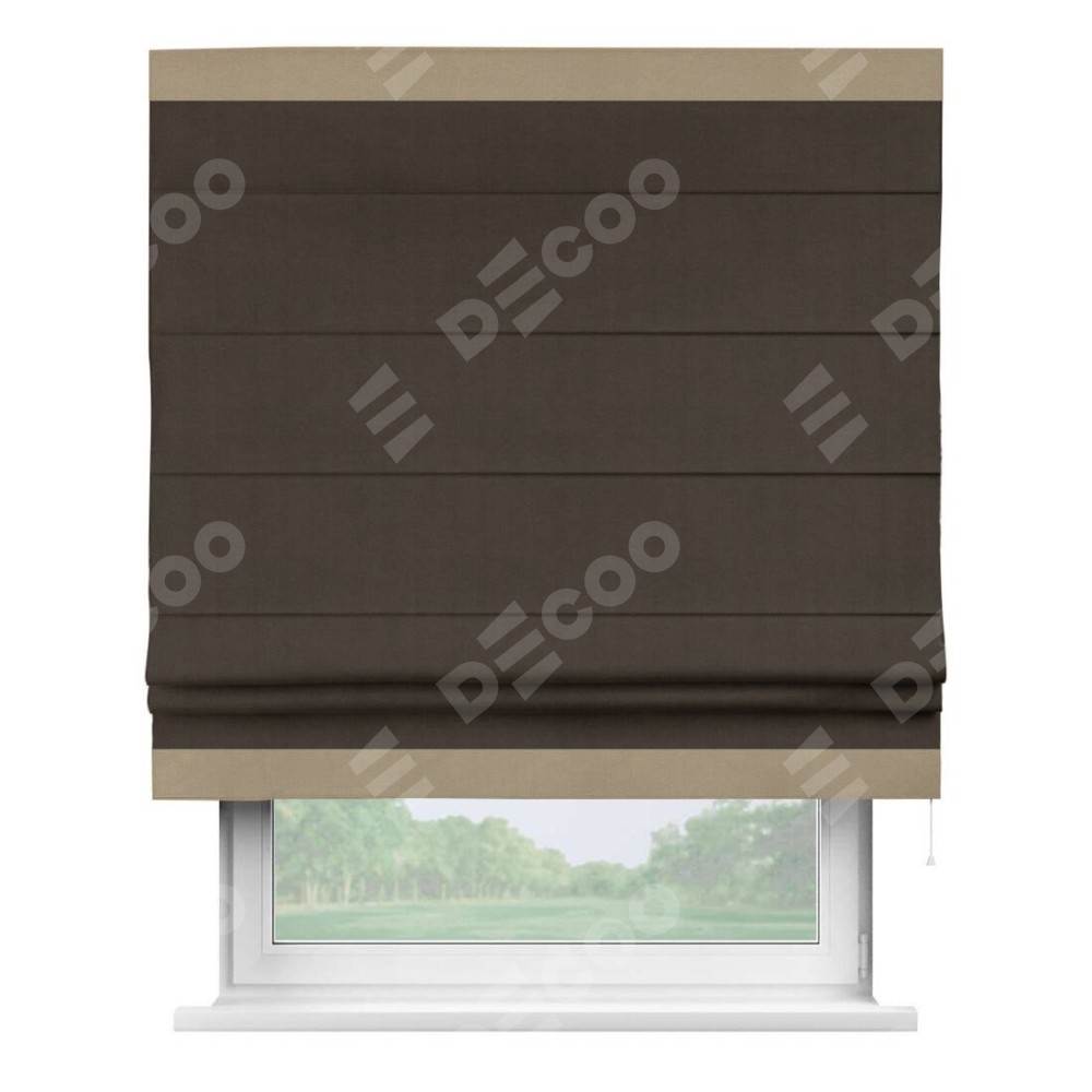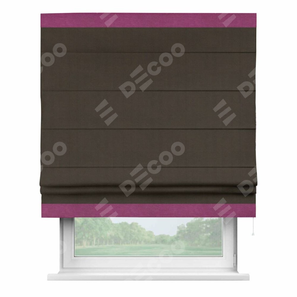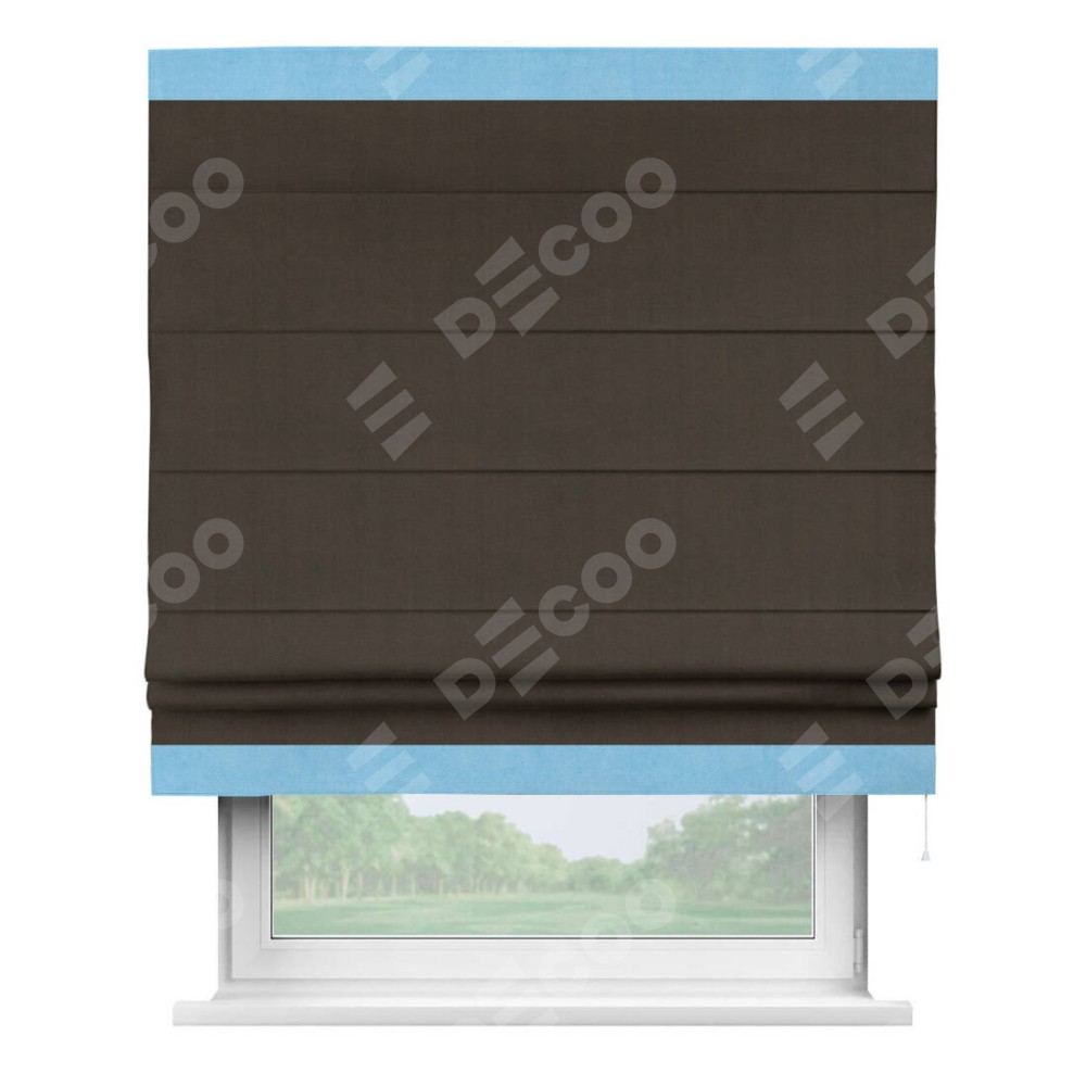 Римская штора производителя «Cortin», используется для проёма, пошита из ткани вельвет тёмно-коричневый, артикул ткани 30991. Отделка шторы кантом «Горизонт», ткань для канта используется из вельвета разной расцветки на выбор. Имеет универсальный механизм и подходит для монтажа: на потолок, на стену и в нишу.