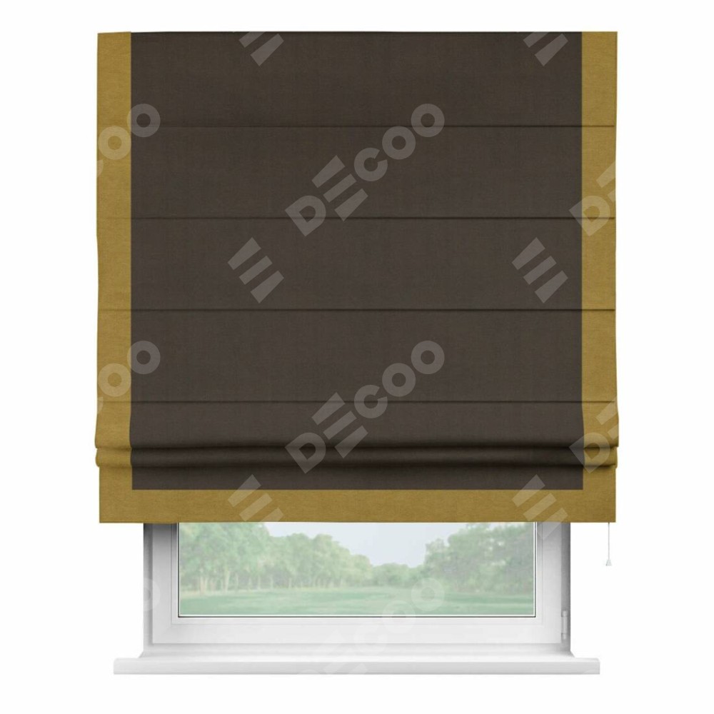 Римская штора производителя «Cortin», используется для проёма, пошита из ткани вельвет тёмно-коричневый, артикул ткани 30991. Отделка шторы кантом «Виктория», ткань для канта используется из вельвета разной расцветки на выбор. Имеет универсальный механизм и подходит для монтажа: на потолок, на стену и в нишу.