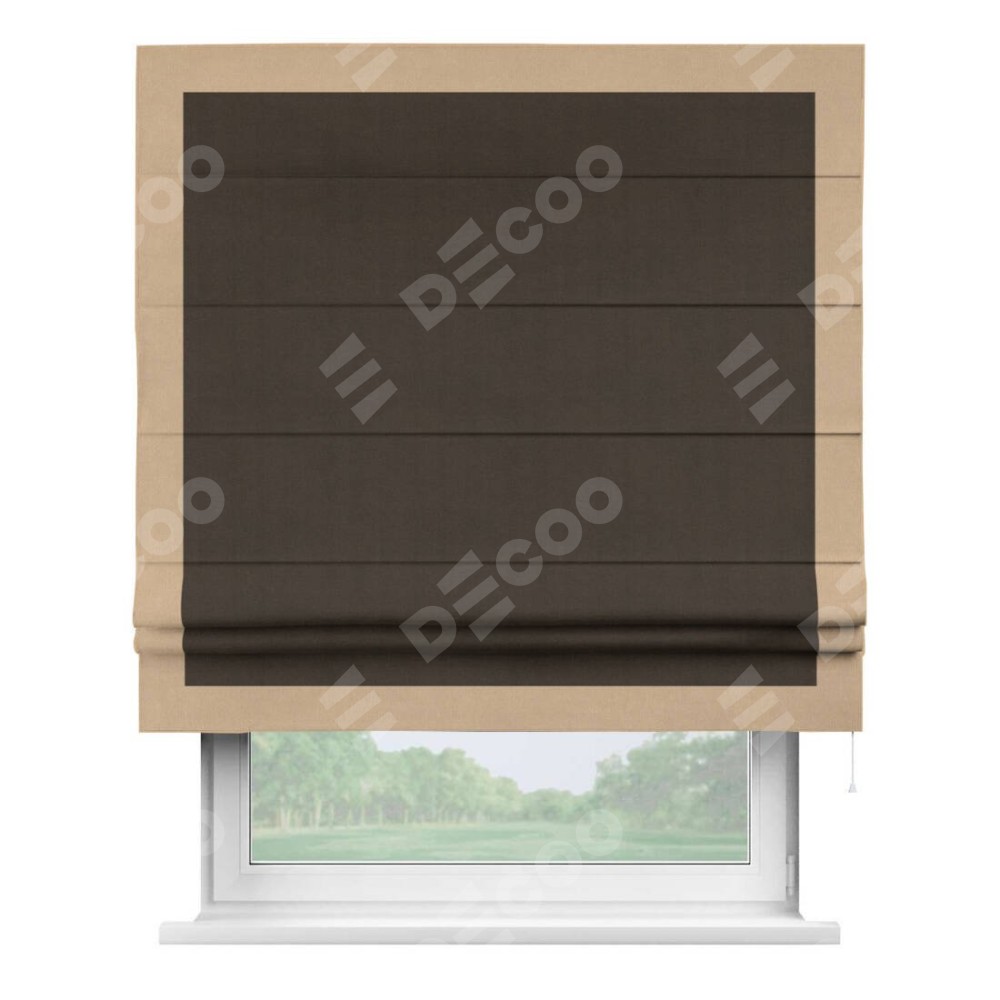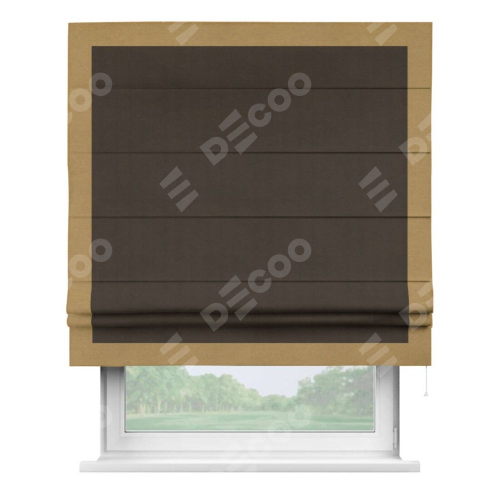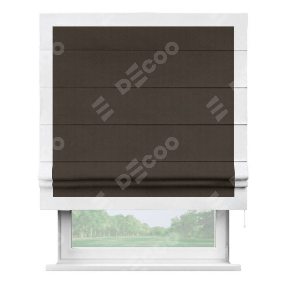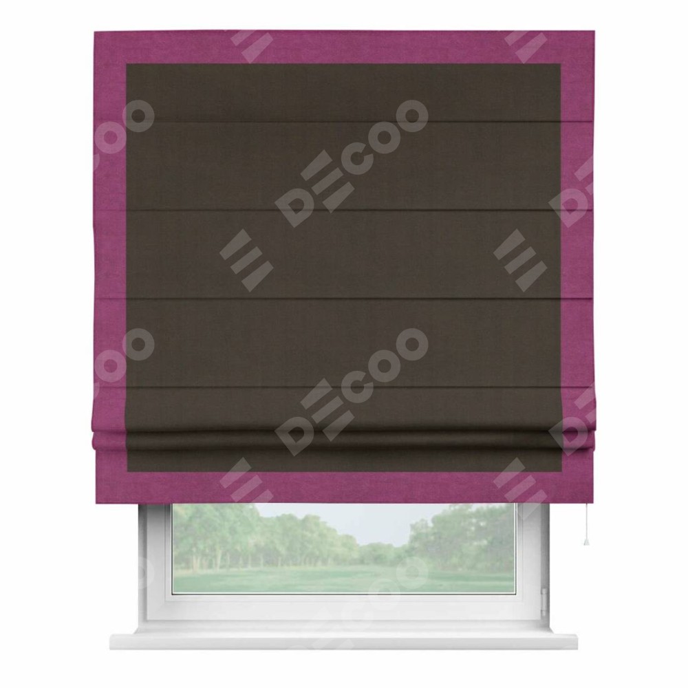 Римская штора производителя «Cortin», используется для проёма, пошита из ткани вельвет тёмно-коричневый, артикул ткани 30991. Отделка шторы кантом «Чесс», ткань для канта используется из вельвета разной расцветки на выбор. Имеет универсальный механизм и подходит для монтажа: на потолок, на стену и в нишу.