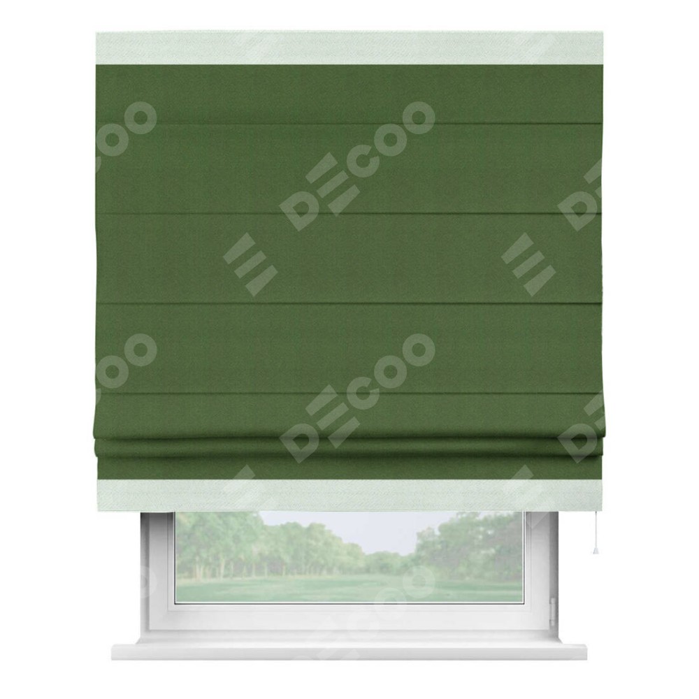 Римская штора производителя «Cortin», используется для проёма, пошита из ткани блэкаут однотонный зелёный перламутр, артикул ткани 81859−2. Отделка шторы кантом «Горизонт», ткань для канта используется из блэкаута однотонного разной расцветки на выбор. Имеет универсальный механизм и подходит для монтажа: на потолок, на стену и в нишу.