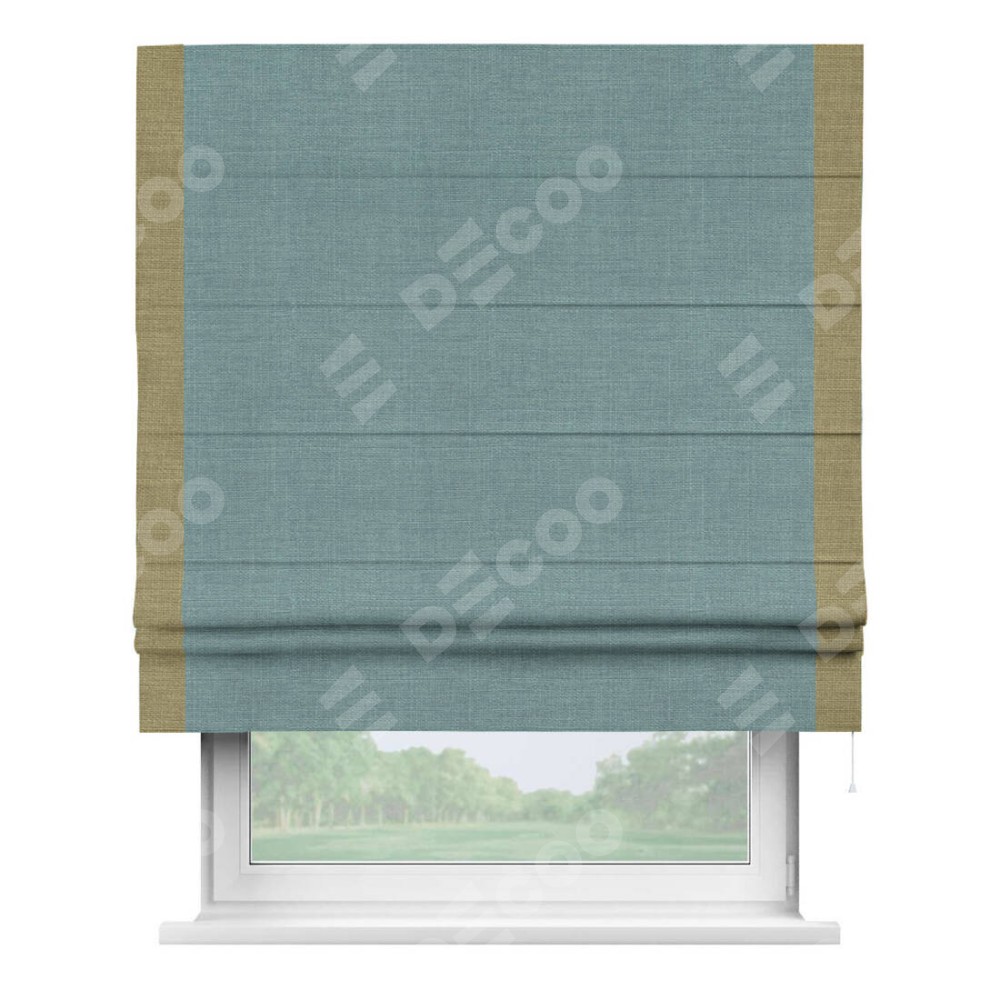 Римская штора производителя «Cortin», используется для проёма, пошита из ткани лён голубой, артикул 74736. Отделка шторы кантом «Стрим Дуо», ткань для канта используется из льна разной расцветки на выбор. Имеет универсальный механизм и подходит для монтажа: на потолок, на стену и в нишу.