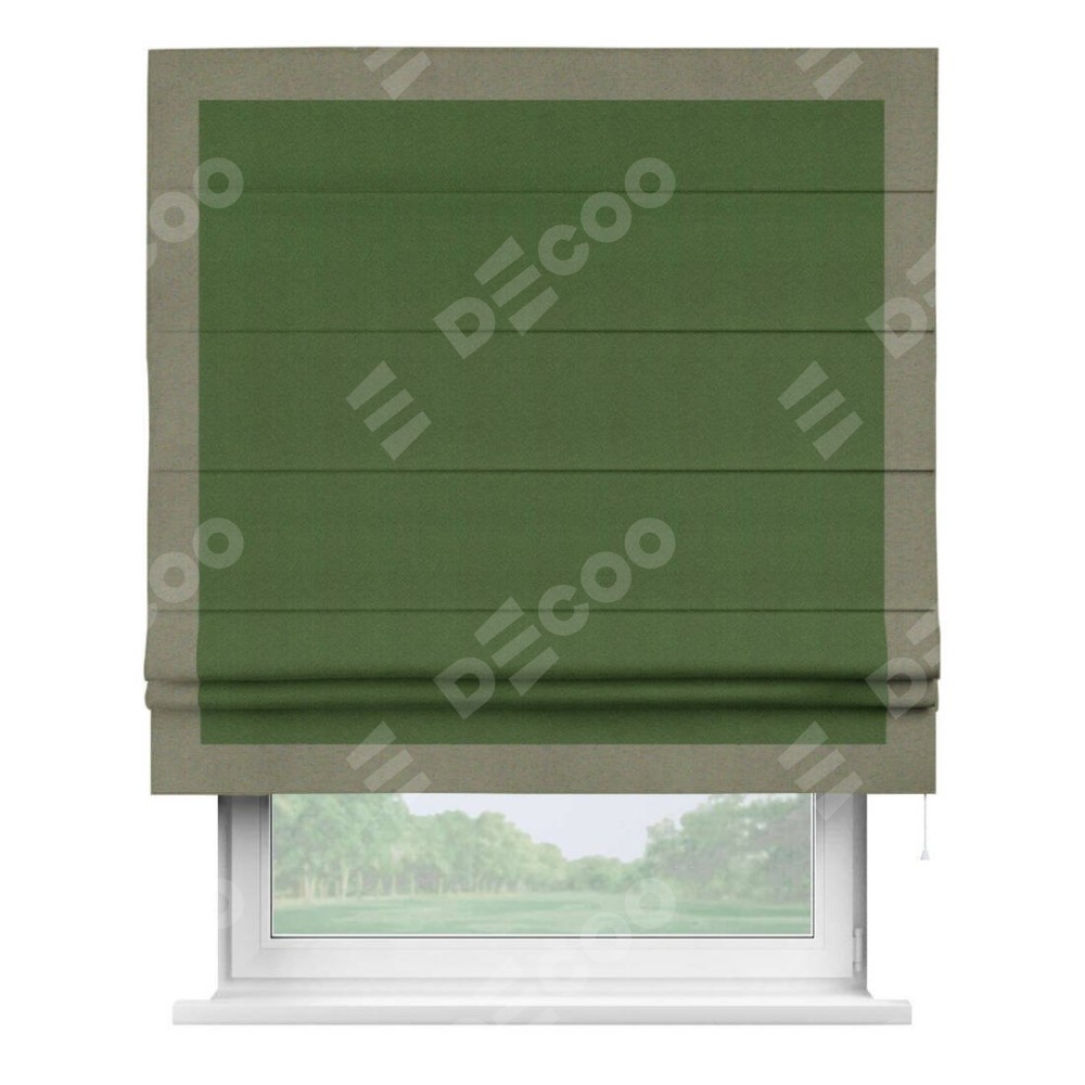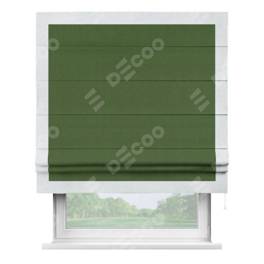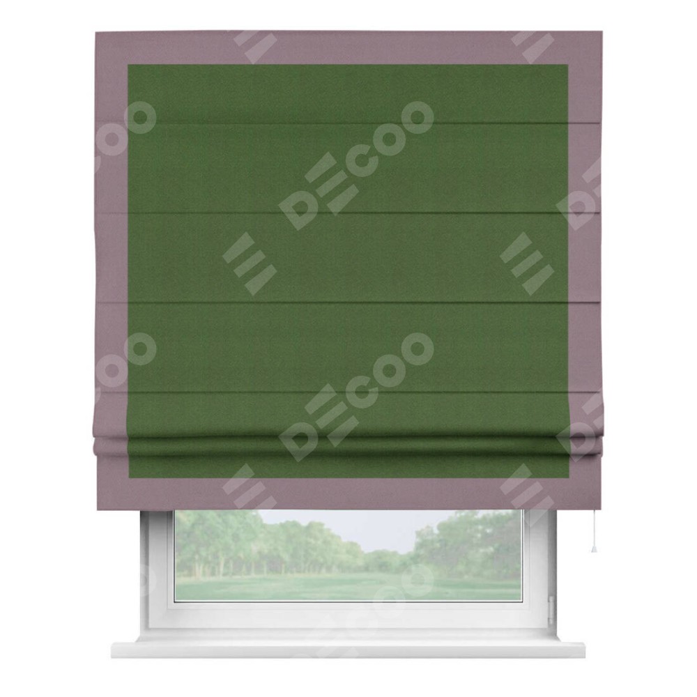 Римская штора производителя «Cortin», используется для проёма, пошита из ткани блэкаут однотонный зелёный перламутр, артикул ткани 81859−2. Отделка шторы кантом «Чесс», ткань для канта используется из блэкаута однотонного разной расцветки на выбор. Имеет универсальный механизм и подходит для монтажа: на потолок, на стену и в нишу.