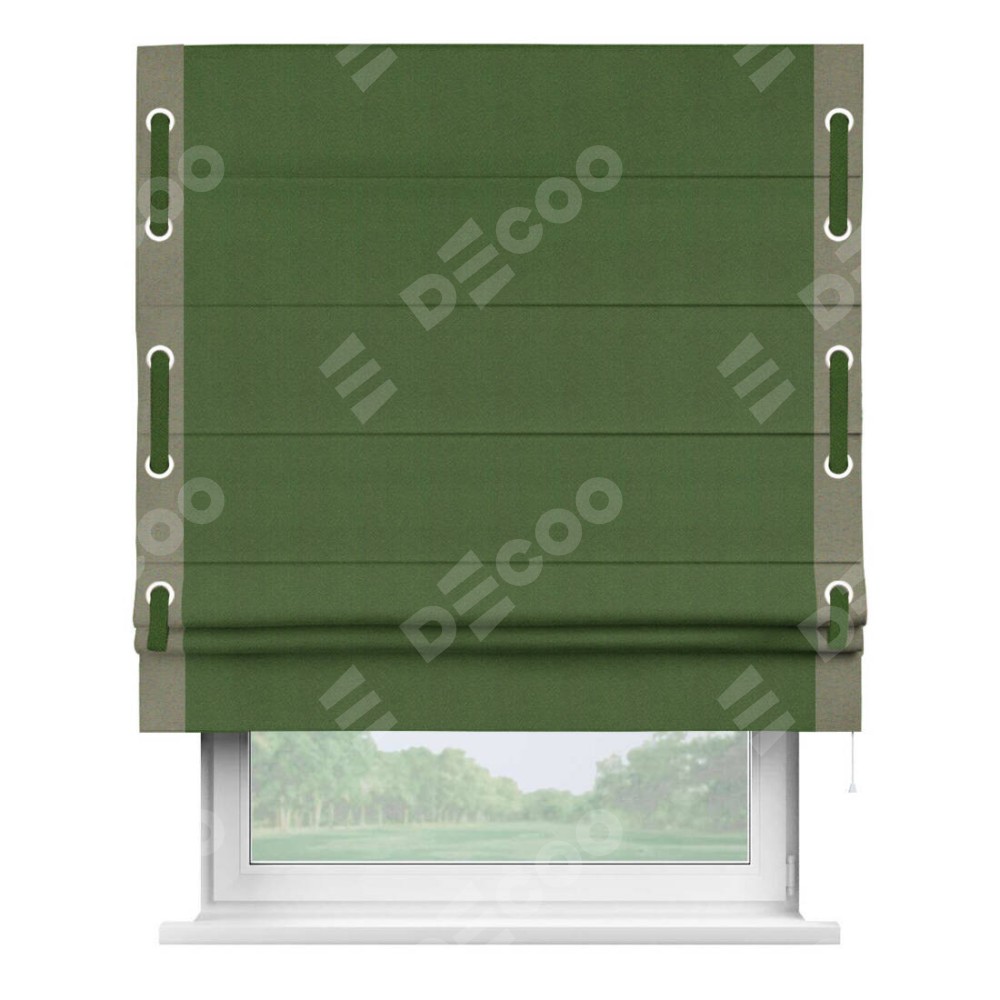 Римская штора производителя «Cortin», используется для проёма, пошита из ткани блэкаут однотонный зелёный перламутр, артикул ткани 81859−2. Отделка шторы кантом «Стрим Дуо» на кантах расположены люверсы с пояском, ткань для канта используется из блэкаута однотонного разной расцветки на выбор. Ткань для пояска обычно используется из основной ткани шторы, а так же можно сделать из любой расцветки по желанию. Имеет универсальный механизм и подходит для монтажа: на потолок, на стену и в нишу.