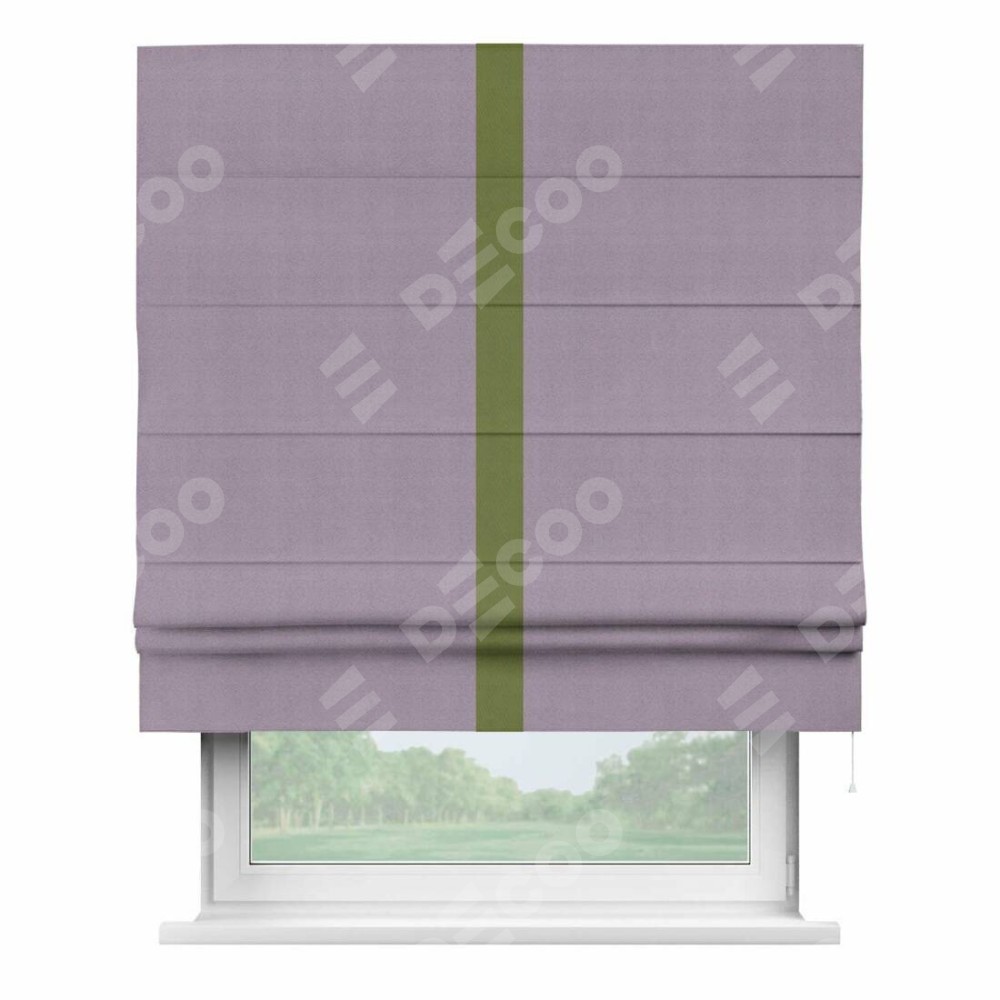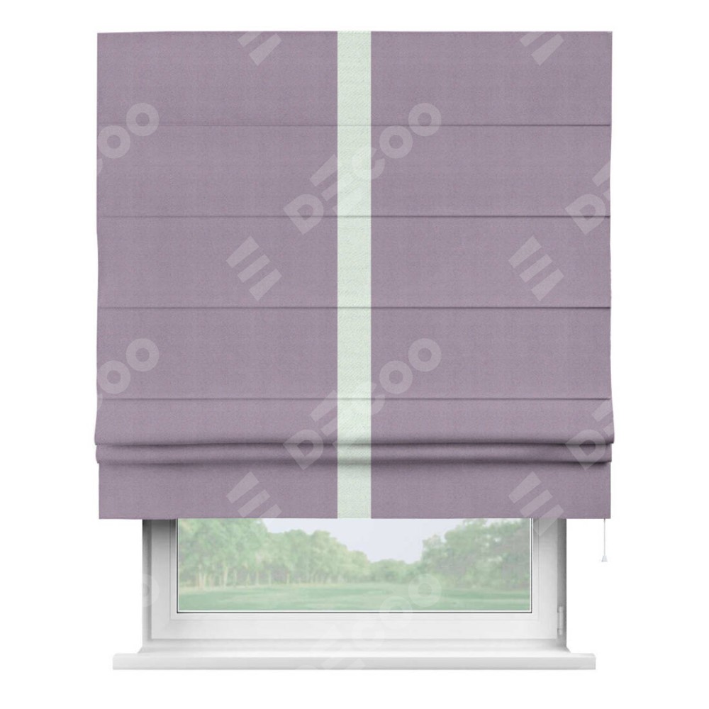 Римская штора производителя «Cortin», используется для проёма, пошита из ткани блэкаут однотонный светло-сиреневый, артикул ткани 29333−1. Отделка шторы кантом «Хайвей», ткань для канта используется из блэкаута однотонного разной расцветки на выбор. Имеет универсальный механизм и подходит для монтажа: на потолок, на стену и в нишу.