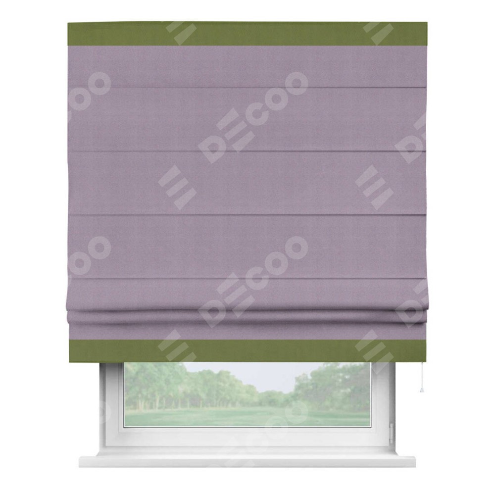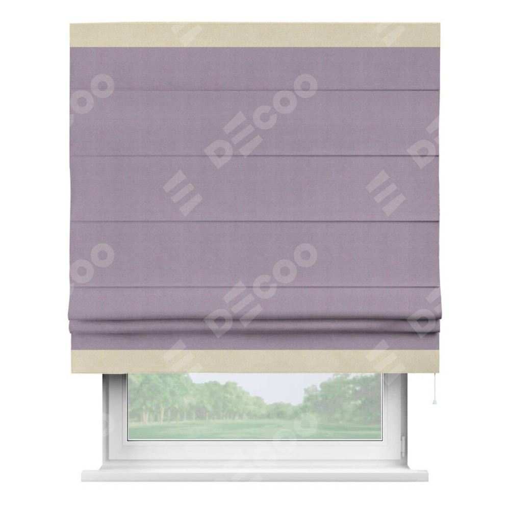 Римская штора производителя «Cortin», используется для проёма, пошита из ткани блэкаут однотонный светло-сиреневый, артикул ткани 29333−1. Отделка шторы кантом «Горизонт», ткань для канта используется из блэкаута однотонного разной расцветки на выбор. Имеет универсальный механизм и подходит для монтажа: на потолок, на стену и в нишу.