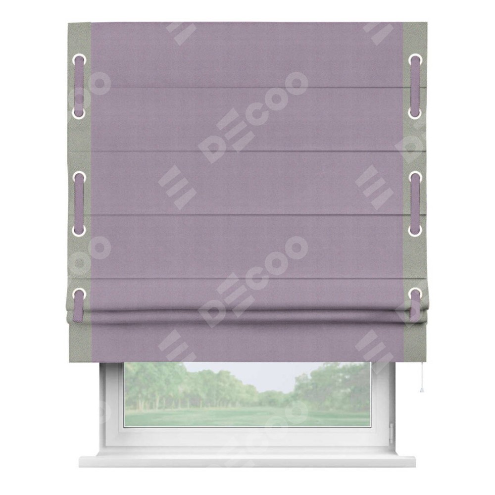 Римская штора производителя «Cortin», используется для проёма, пошита из ткани блэкаут однотонный светло-сиреневый, артикул ткани 29333−1. Отделка шторы кантом «Стрим Дуо» на кантах расположены люверсы с пояском, ткань для канта используется из блэкаута однотонного разной расцветки на выбор. Ткань для пояска обычно используется из основной ткани шторы, а так же можно сделать из любой расцветки по желанию. Имеет универсальный механизм и подходит для монтажа: на потолок, на стену и в нишу.