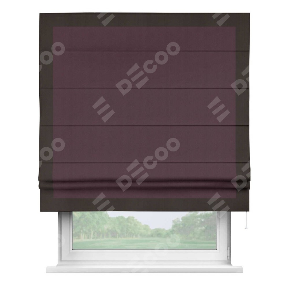 Римская штора производителя «Cortin», используется для проёма, пошита из ткани блэкаут однотонный сиреневый, артикул ткани 29333−2. Отделка шторы кантом «Чесс», ткань для канта используется из блэкаута однотонного разной расцветки на выбор. Имеет универсальный механизм и подходит для монтажа: на потолок, на стену и в нишу.