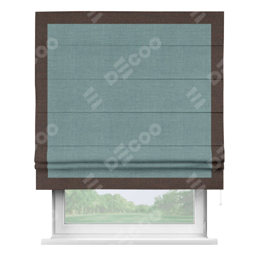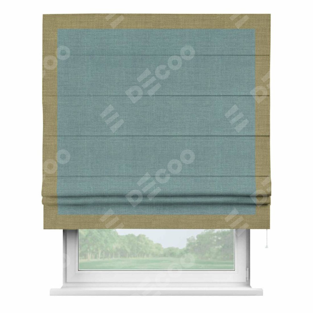 Римская штора производителя «Cortin», используется для проёма, пошита из ткани лён голубой, артикул 74736. Отделка шторы кантом «Чесс», ткань для канта используется из льна разной расцветки на выбор. Имеет универсальный механизм и подходит для монтажа: на потолок, на стену и в нишу.