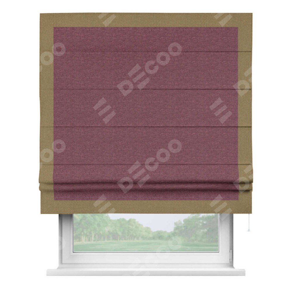 Римская штора производителя «Cortin», используется для проёма, пошита из ткани лён димаут марсала, артикул 1602. Отделка шторы кантом «Чесс», ткань для канта используется из льна димаут разной расцветки на выбор. Имеет универсальный механизм и подходит для монтажа: на потолок, на стену и в нишу.