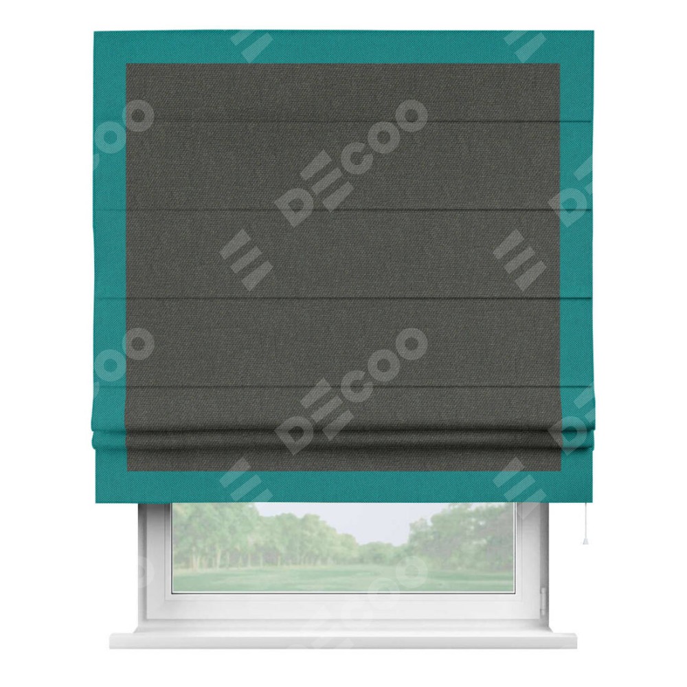 Римская штора производителя «Cortin», используется для проёма, пошита из ткани лён димаут графитово-серый, артикул 35129. Отделка шторы кантом «Чесс», ткань для канта используется из льна димаут разной расцветки на выбор. Имеет универсальный механизм и подходит для монтажа: на потолок, на стену и в нишу.