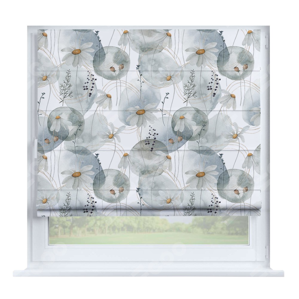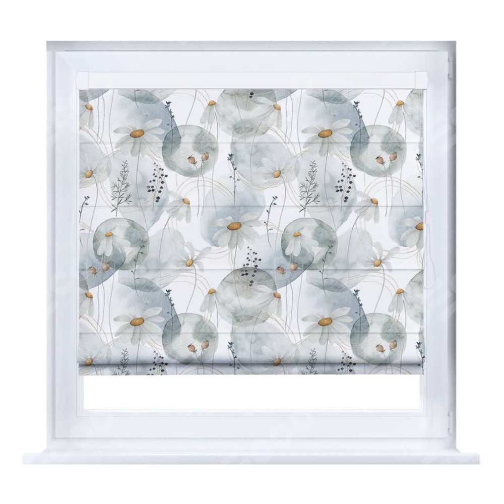 Римская штора производителя «Cortin», устанавливается на створку окна, пошита из ткани блэкаут с нанесением сублимационной печати «Ромашки акварель». Штора шьётся по индивидуальным размерам, для данного типа римской шторы возможная ширина от 35 до 150 см., высота до 250 см.