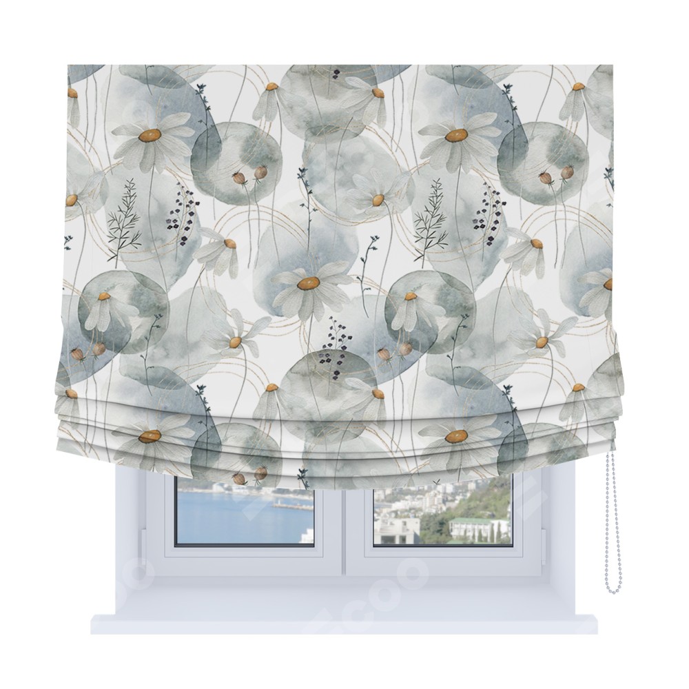 Римская штора Soft производителя «Cortin», используется для проёма, пошита из ткани блэкаут с нанесением сублимационной печати «Ромашки акварель». Имеет универсальный механизм и подходит для монтажа: на потолок, на стену и в нишу. В отличие от стандартных римских штор, римская штора Soft не имеет горизонтальных вставок и нижнего отвеса. Это позволяет ткани произвольно драпироваться в свободные мягкие складки.