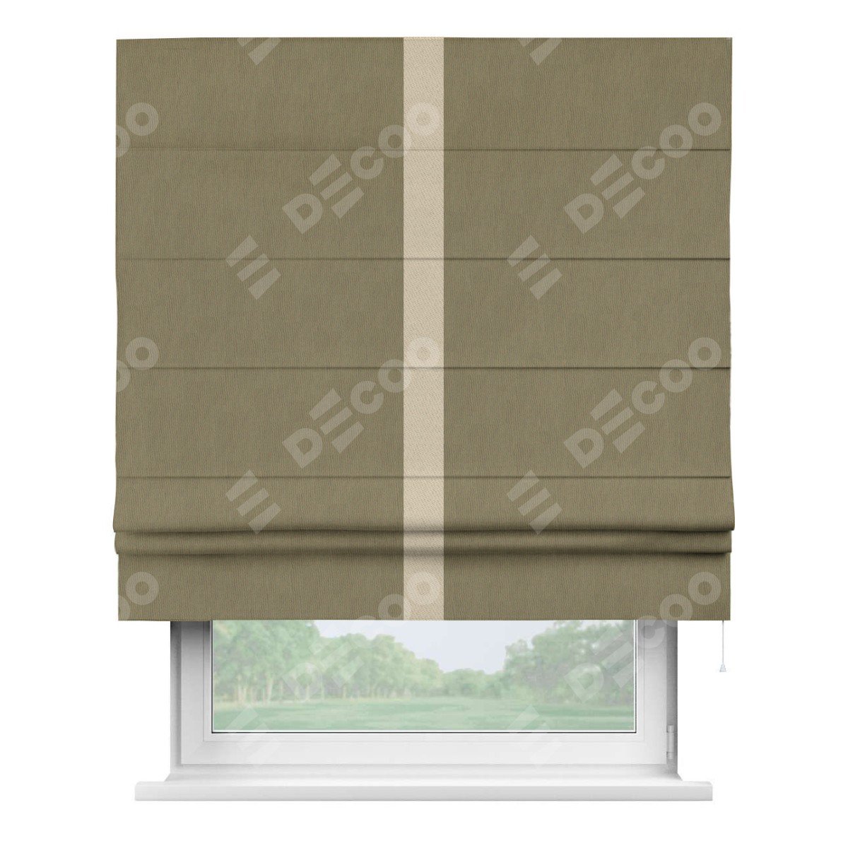 Римская штора производителя «Cortin», используется для проёма, пошита из ткани блэкаут однотонный бежево-золотой, артикул ткани 12095−2. Отделка шторы кантом «Хайвей», ткань для канта используется из блэкаута однотонного разной расцветки на выбор. Имеет универсальный механизм и подходит для монтажа: на потолок, на стену и в нишу.