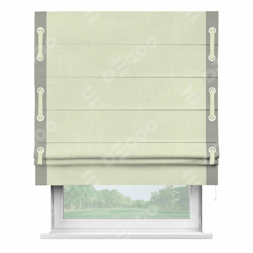 Римская штора производителя «Cortin», используется для проёма, пошита из ткани блэкаут однотонный сливочный, артикул ткани 6668−02. Отделка шторы кантом «Стрим Дуо» на кантах расположены люверсы с пояском, ткань для канта используется из блэкаута однотонного разной расцветки на выбор. Ткань для пояска обычно используется из основной ткани шторы, а так же можно сделать из любой расцветки по желанию. Имеет универсальный механизм и подходит для монтажа: на потолок, на стену и в нишу.
