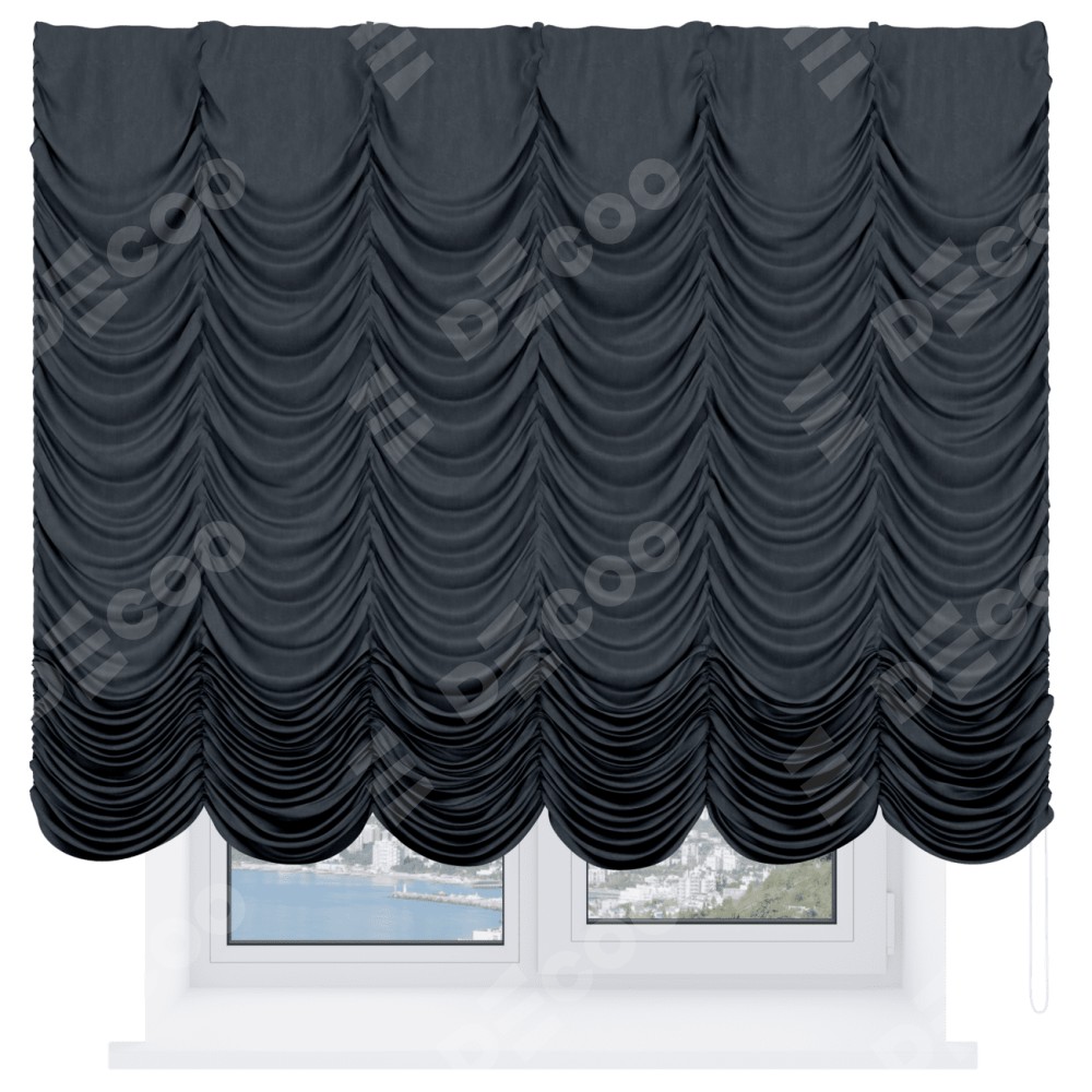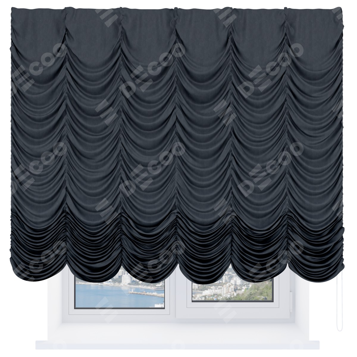 Французская штора производителя «Cortin», используется для проёма, пошита из ткани вельвет тёмно-серый, артикул ткани 33811. Имеет универсальный механизм и подходит для монтажа: на потолок и на стену.