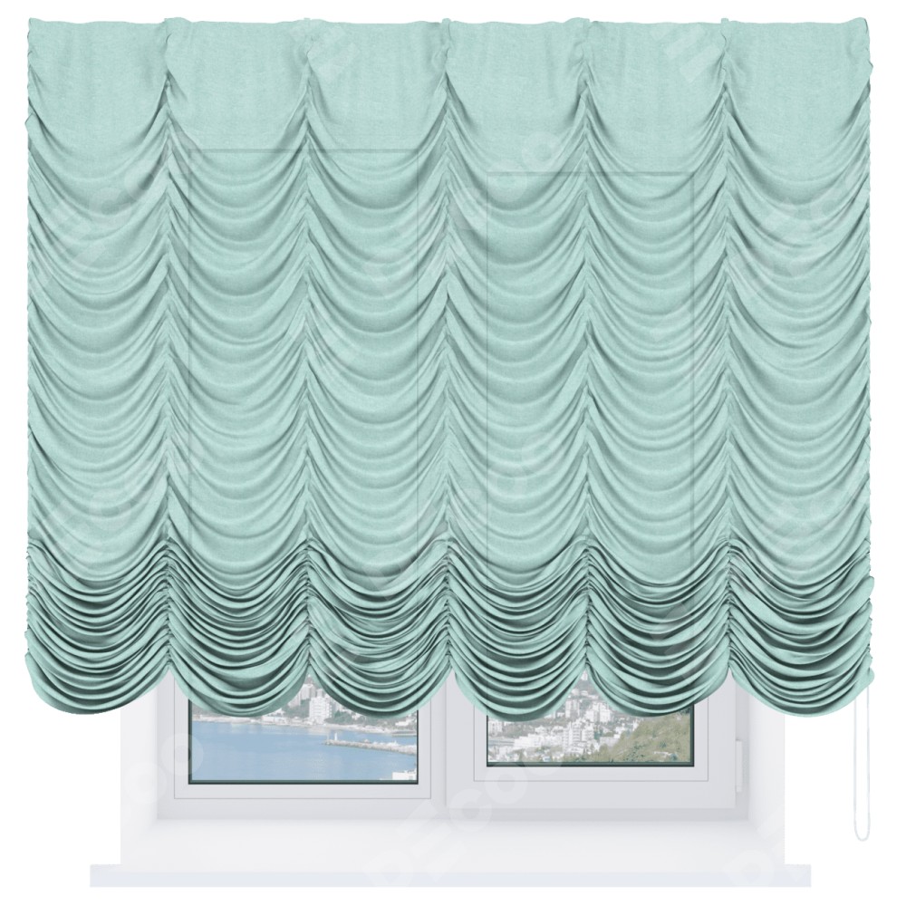 Французская штора производителя «Cortin», используется для проёма, пошита из ткани лён кашемир мятный, артикул ткани 21617. Имеет универсальный механизм и подходит для монтажа: на потолок и на стену.