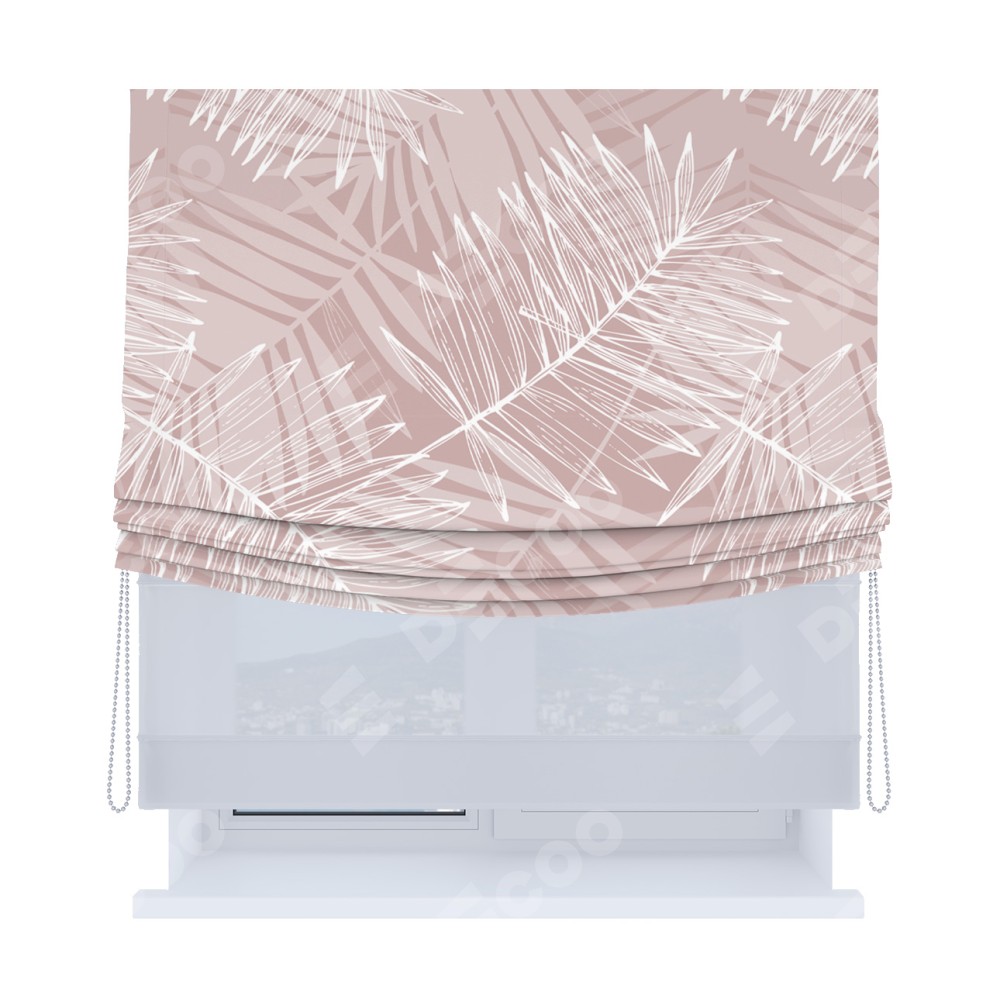 Римская штора день-ночь производителя «Cortin», используется для проёма, пошита из двух полотен, с лицевой блэкаут с нанесением сублимационной печати «Бежевые тропики», вторая ткань тюль (по стандарту комплектуется тюль белого цвета артикул V-01). Имеет универсальный механизм и подходит для монтажа: на потолок, на стену и в нишу. Удобное управление каждой шторой отдельно.