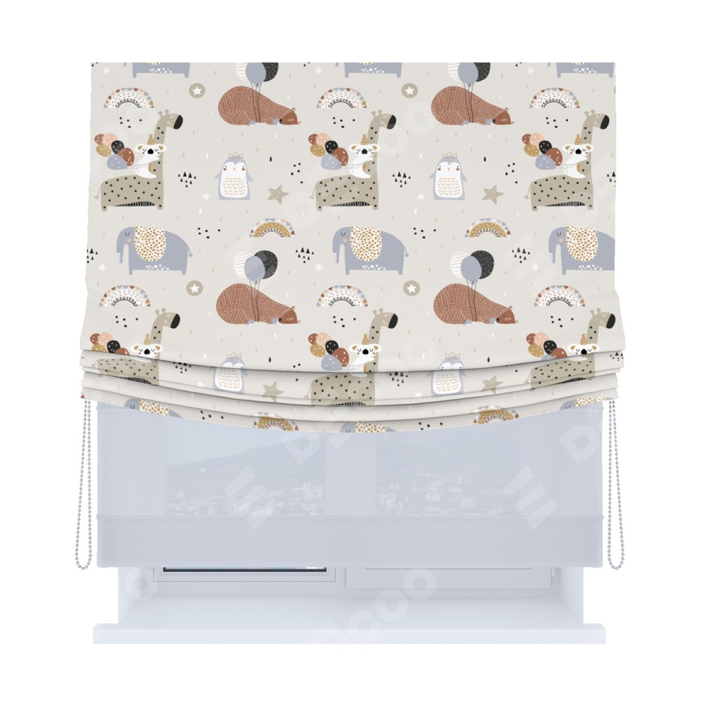 Римская штора день-ночь производителя «Cortin», используется для проёма, пошита из двух полотен, с лицевой блэкаут с нанесением сублимационной печати «Вечеринка животных», вторая ткань тюль (по стандарту комплектуется тюль белого цвета артикул V-01). Имеет универсальный механизм и подходит для монтажа: на потолок, на стену и в нишу. Удобное управление каждой шторой отдельно.