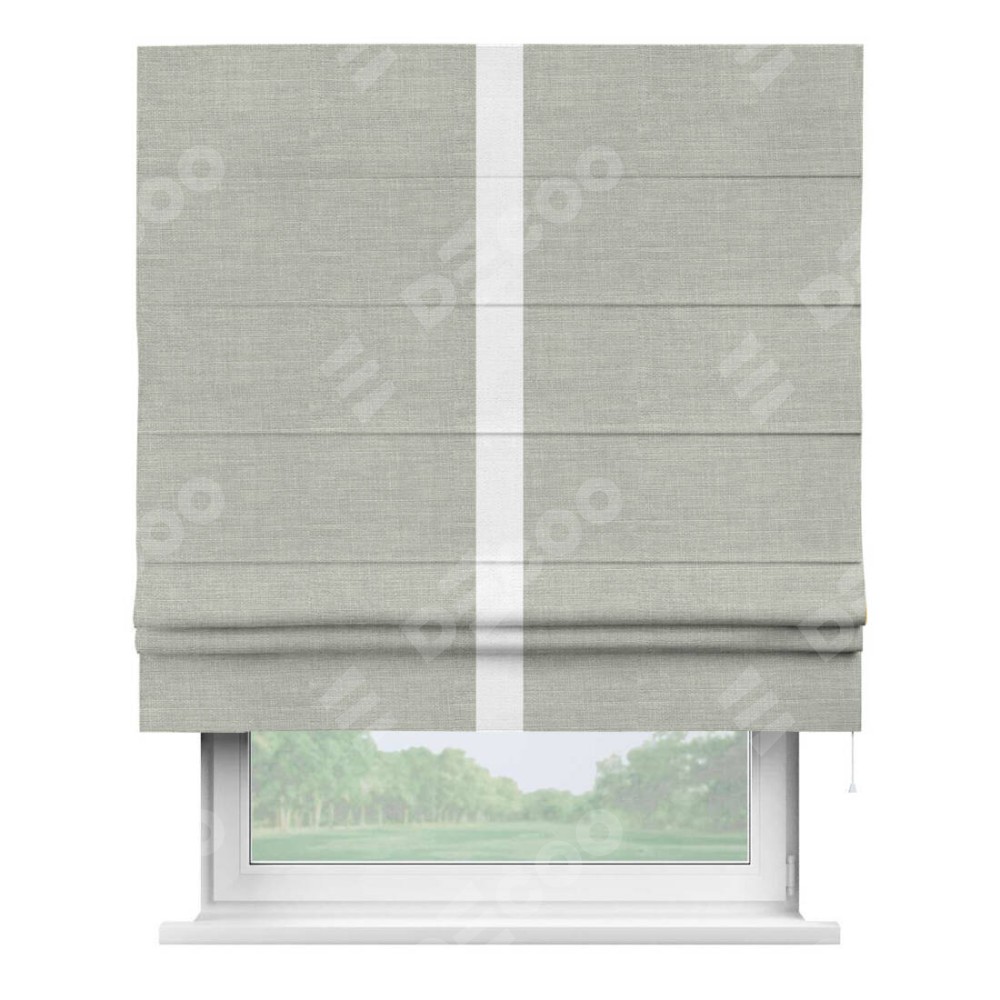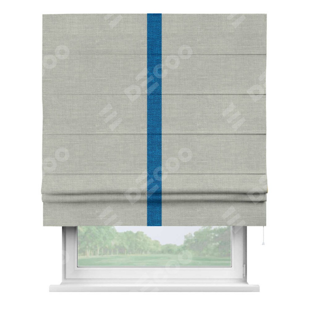 Римская штора производителя «Cortin», используется для проёма, пошита из ткани лён серый, артикул 7440. Отделка шторы кантом «Хайвэй», ткань для канта используется из льна разной расцветки на выбор. Имеет универсальный механизм и подходит для монтажа: на потолок, на стену и в нишу.