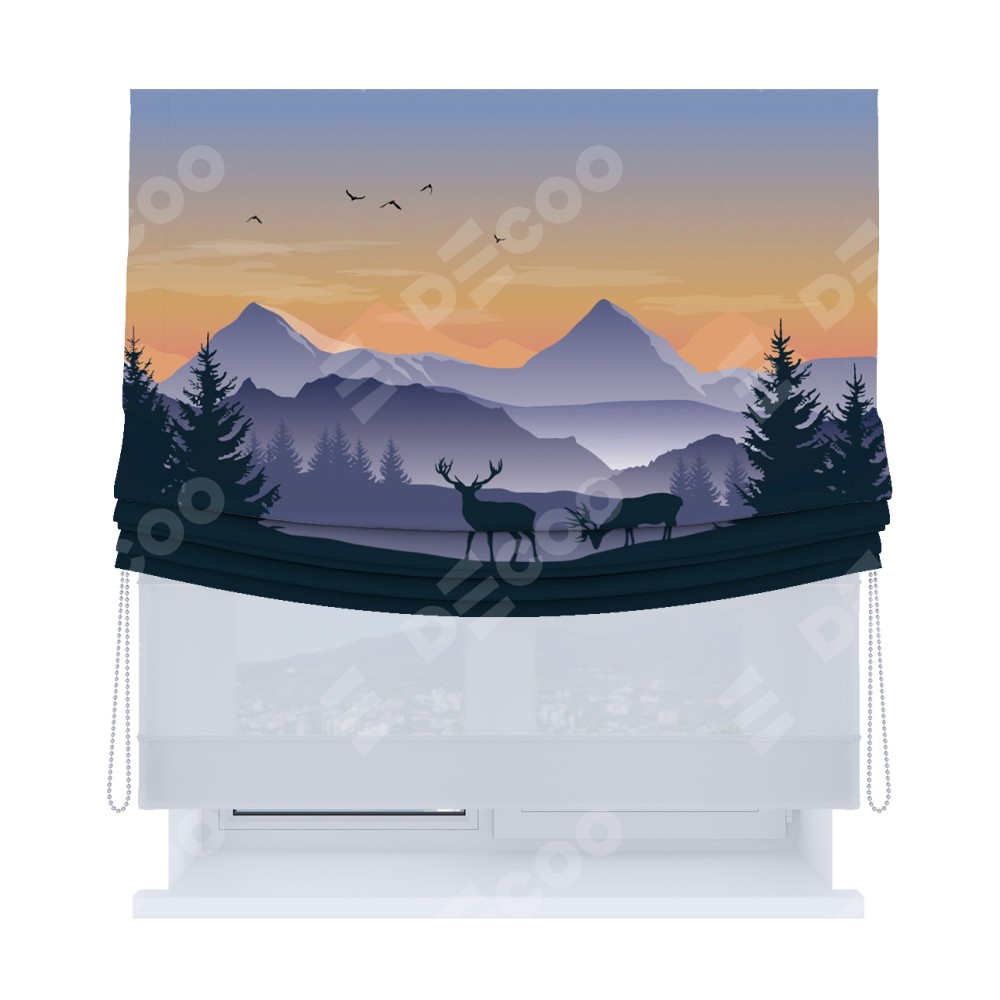 Римская штора день-ночь производителя «Cortin», используется для проёма, пошита из двух полотен, с лицевой блэкаут с нанесением сублимационной печати «Закат в горах», вторая ткань тюль (по стандарту комплектуется тюль белого цвета артикул V-01). Имеет универсальный механизм и подходит для монтажа: на потолок, на стену и в нишу. Удобное управление каждой шторой отдельно.