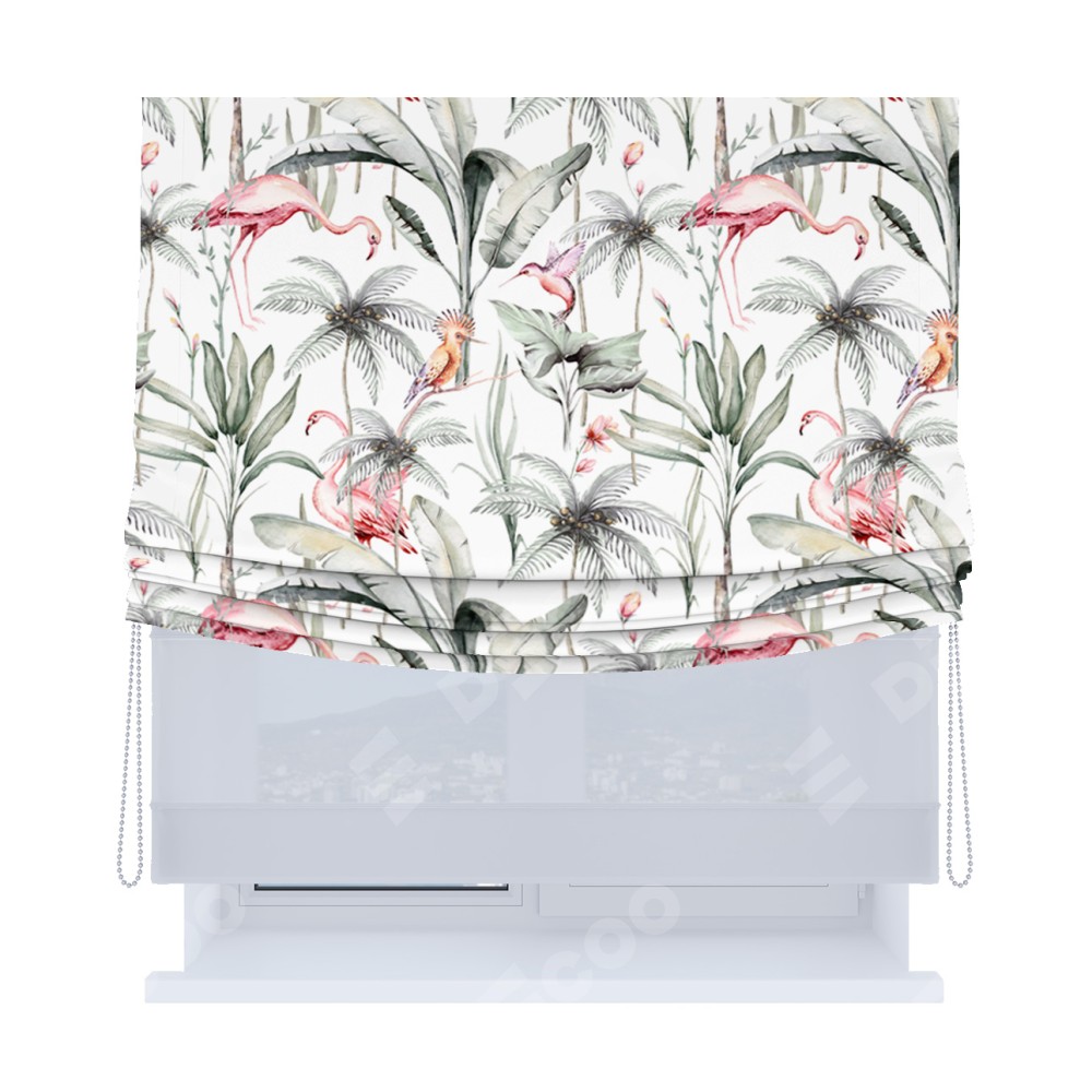 Римская штора день-ночь производителя «Cortin», используется для проёма, пошита из двух полотен, с лицевой блэкаут с нанесением сублимационной печати «Изящные фламинго», вторая ткань тюль (по стандарту комплектуется тюль белого цвета артикул V-01). Имеет универсальный механизм и подходит для монтажа: на потолок, на стену и в нишу. Удобное управление каждой шторой отдельно.