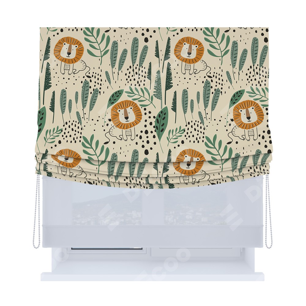 Римская штора день-ночь производителя «Cortin», используется для проёма, пошита из двух полотен, с лицевой блэкаут с нанесением сублимационной печати «Лев из джунглей», вторая ткань тюль (по стандарту комплектуется тюль белого цвета артикул V-01). Имеет универсальный механизм и подходит для монтажа: на потолок, на стену и в нишу. Удобное управление каждой шторой отдельно.