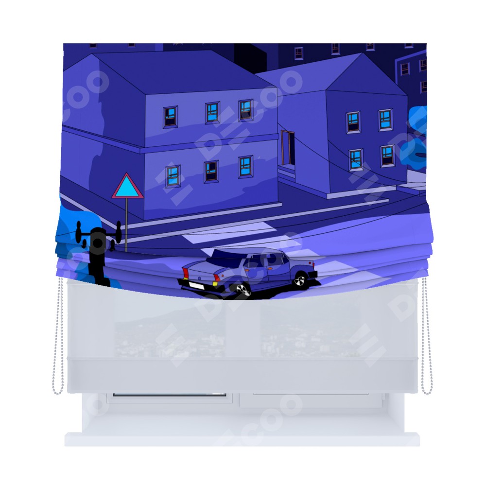 Римская штора день-ночь производителя «Cortin», используется для проёма, пошита из двух полотен, с лицевой блэкаут с нанесением сублимационной печати «Ночные улицы», вторая ткань тюль (по стандарту комплектуется тюль белого цвета артикул V-01). Имеет универсальный механизм и подходит для монтажа: на потолок, на стену и в нишу. Удобное управление каждой шторой отдельно.